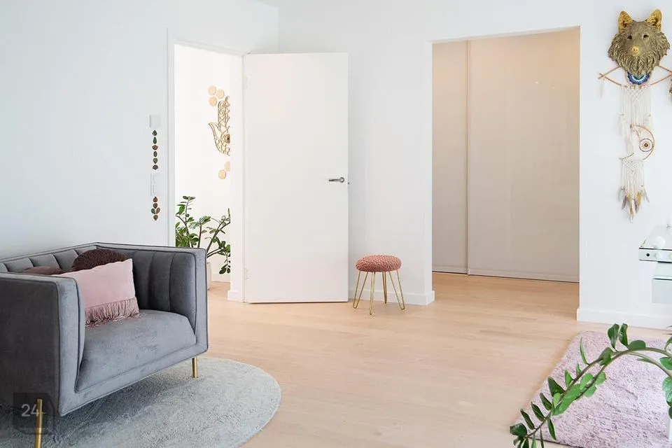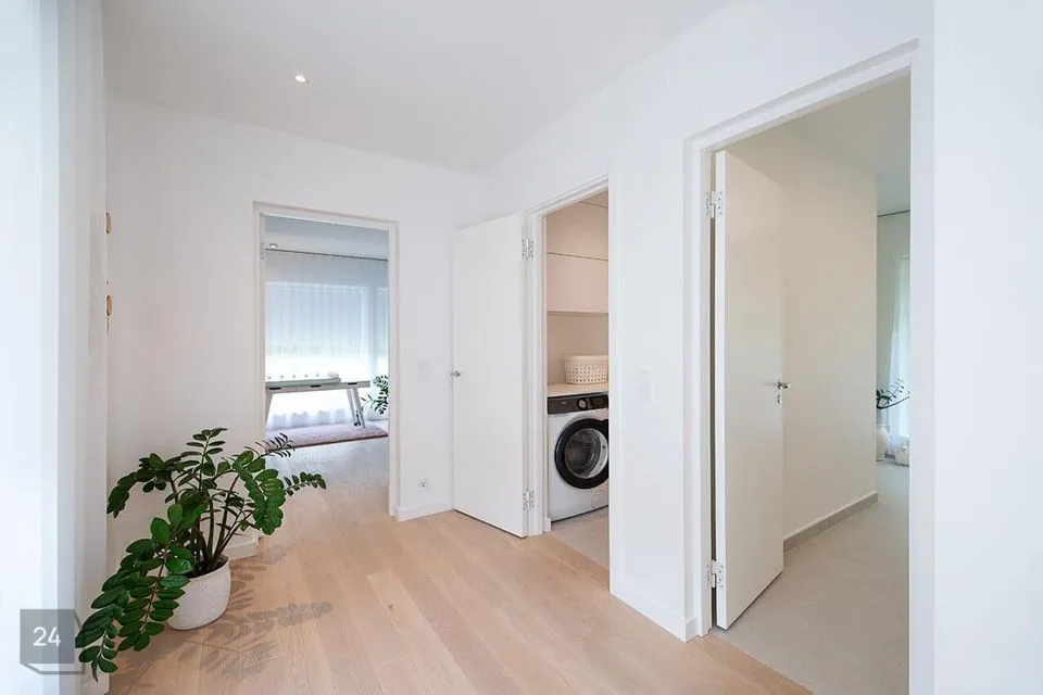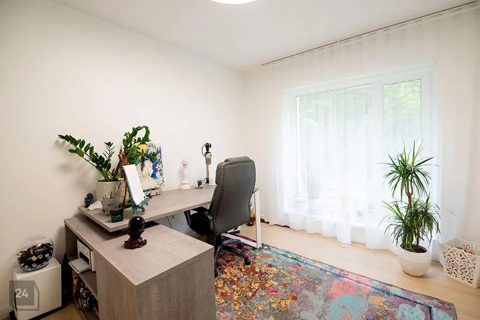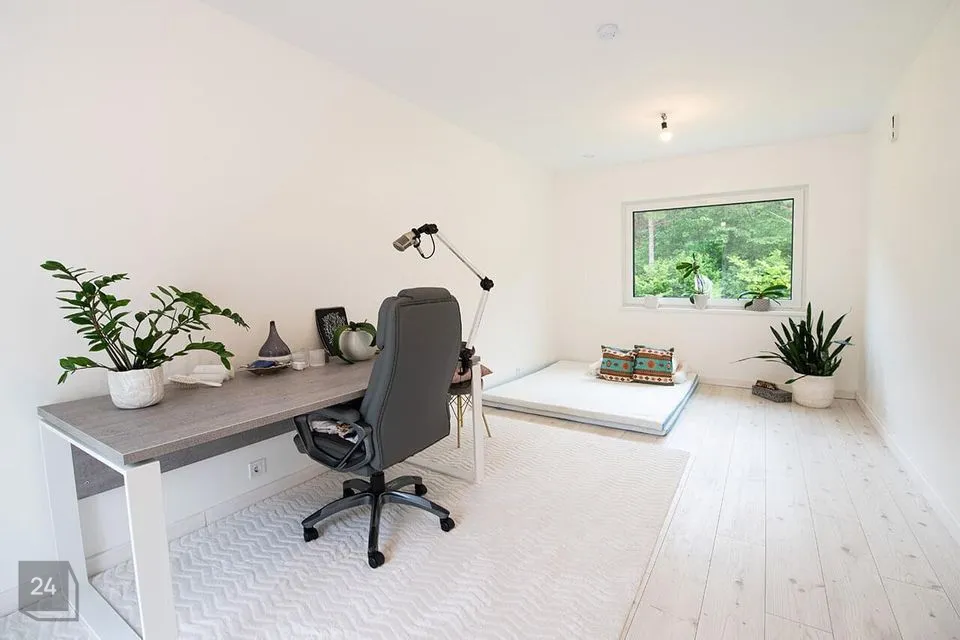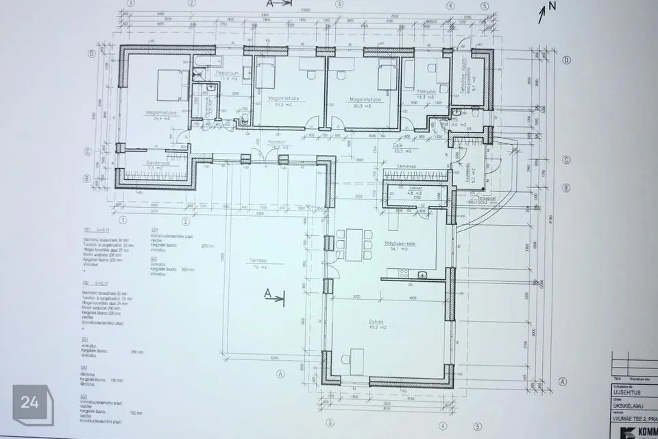 Avar elutuba 42,2m2, avatud söögitoa ja köögiga 34,1m2, mille kõrvale jääb sahver 4,8m2. Tuulekoda 6,2m2, esik 25,2m2, koridor 16,2m2. Kaks magamistuba 20,3m2 + 20,3m2 ja magamistuba 24,4m2 + garderoob 7,2m2. Töötuba/kontor 12,3m2, wc 3m2, pesumasina ruum 3,5m2. Avar pesuruum 11,4m2. Tehnoruum 6,1m2.