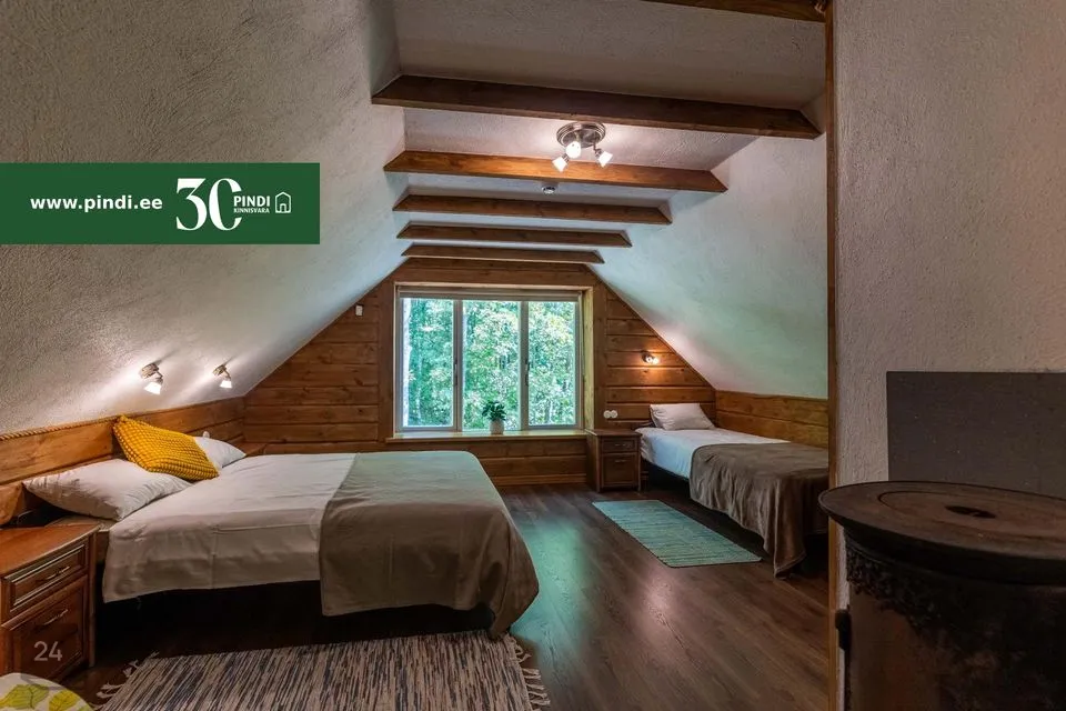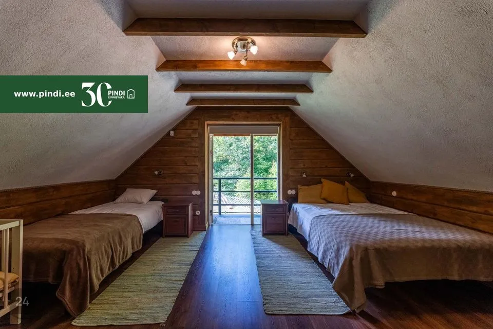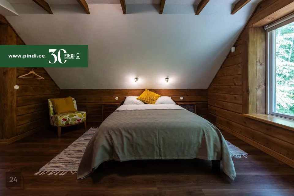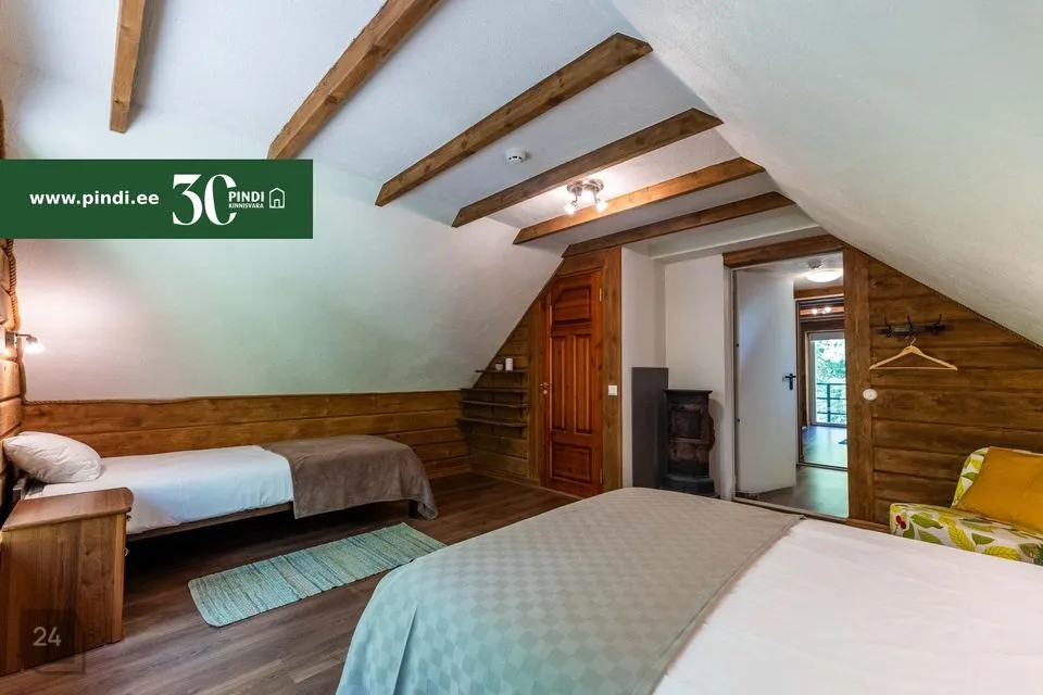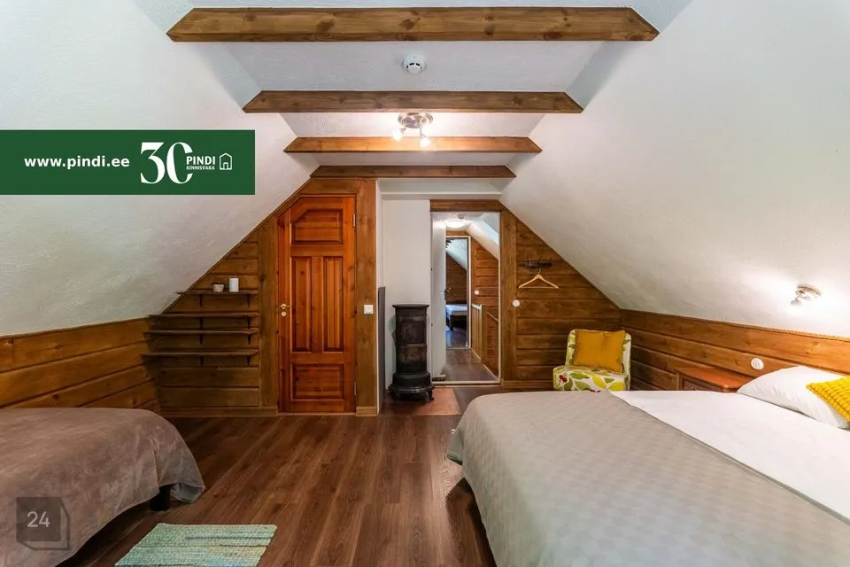 II KORRUS: Katuseaknaga trepihallist saab mööda tammepuidust treppi hoone teisele korrusele, kus asuvad kaks suuremat magamistuba. Mõlemast magamistoast pääseb oma privaatsesse wc ja dushiruumi. Ühel magamistoal on oma rõdu, kust avaneb vaade ümbritsevale looduskaunile alale ja kust saab treppi mööda ka alla terrassile liikuda. Teises magamistoas on lisakütmise võimalusena väike stiilne raudahi.
