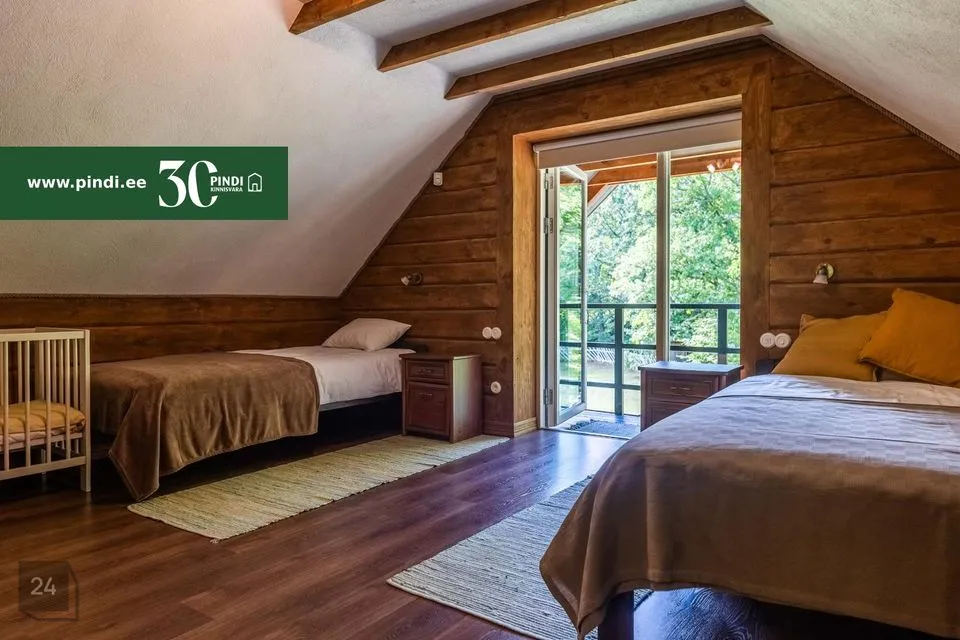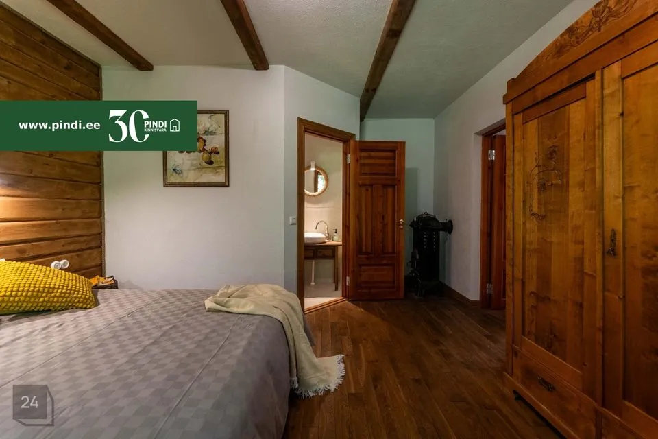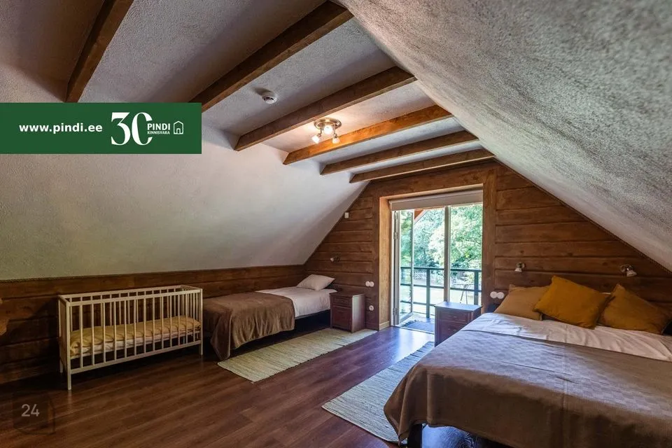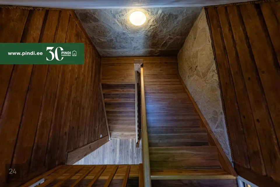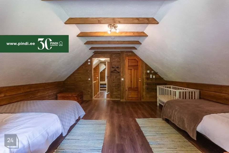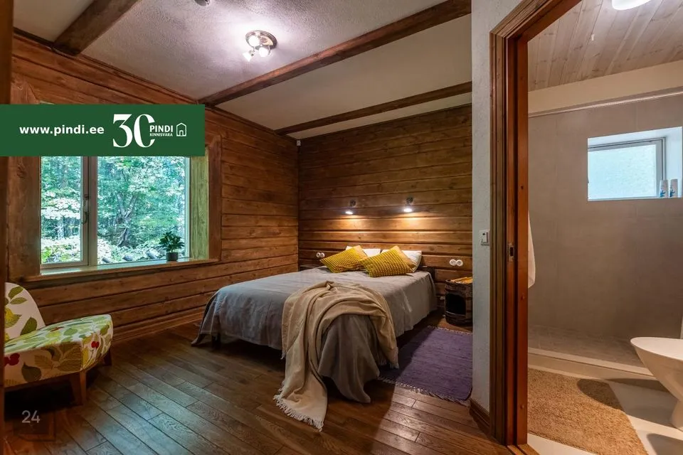 II KORRUS: Katuseaknaga trepihallist saab mööda tammepuidust treppi hoone teisele korrusele, kus asuvad kaks suuremat magamistuba. Mõlemast magamistoast pääseb oma privaatsesse wc ja dushiruumi. Ühel magamistoal on oma rõdu, kust avaneb vaade ümbritsevale looduskaunile alale ja kust saab treppi mööda ka alla terrassile liikuda. Teises magamistoas on lisakütmise võimalusena väike stiilne raudahi.