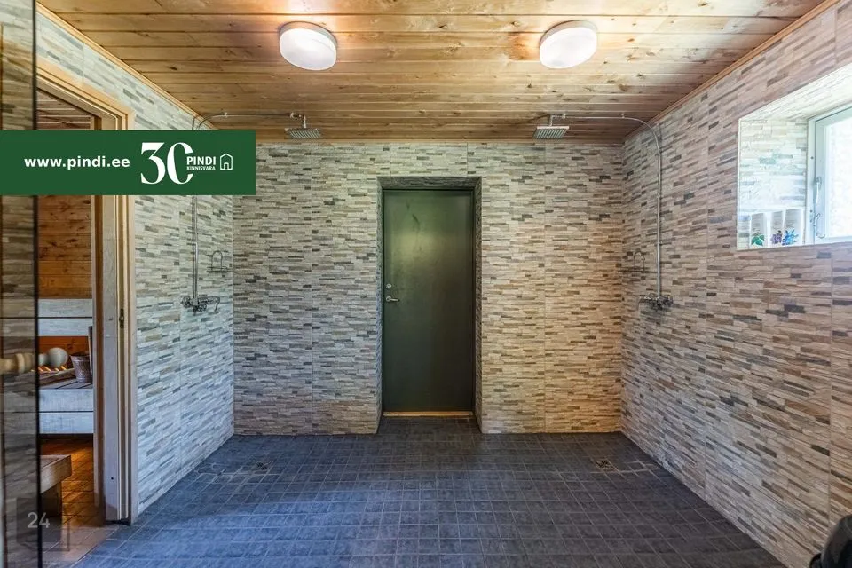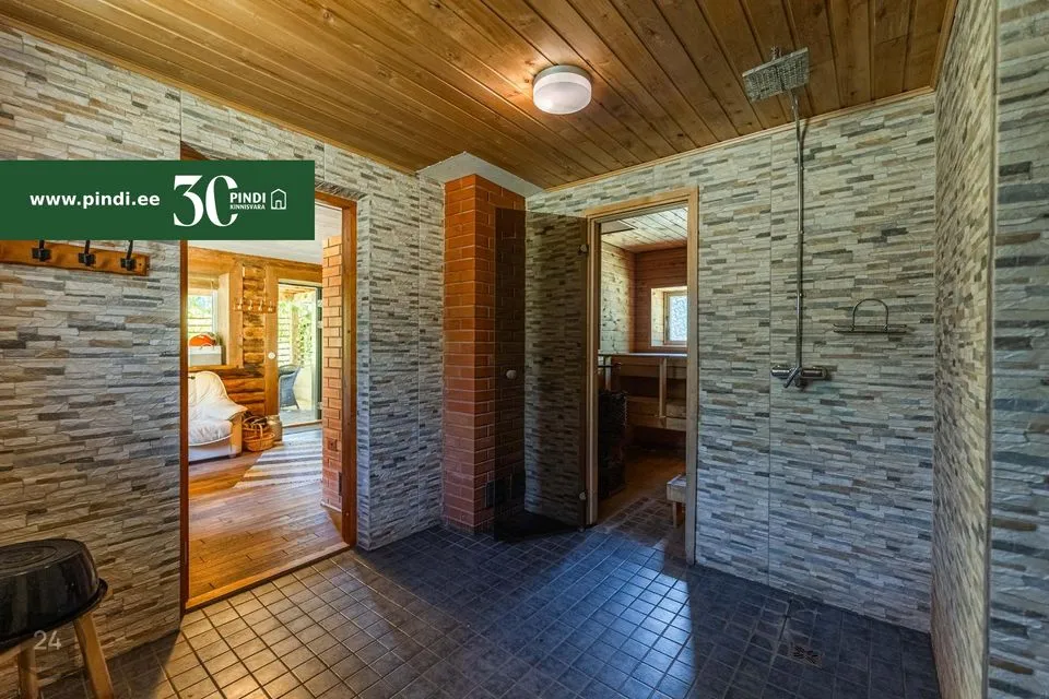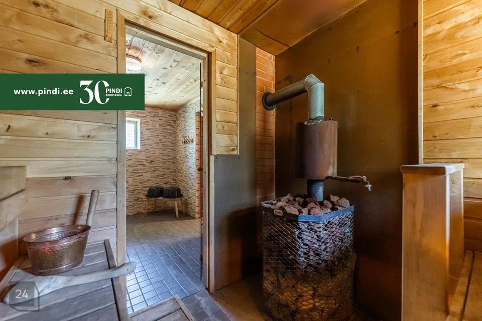 Saunamaja eksterjööris ja interjööris on kasutatud peamajale samaseid väärikaid materjale, mis sobivad kokku kogu kinnistu looduslähedase atmosfääriga.