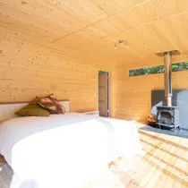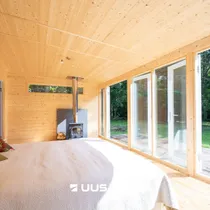 Eraldi sissepääsuga suurte klaasustega magamistuba, mille avaratest akendest avaneb vaade ümbritsevale rohelusele – hommikul ärkad päikesetõusu kuma ja linnulaulu saatel, õhtul naudid terrassilt loojuva päikese viimaseid kiiri.