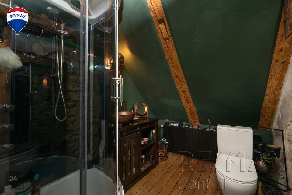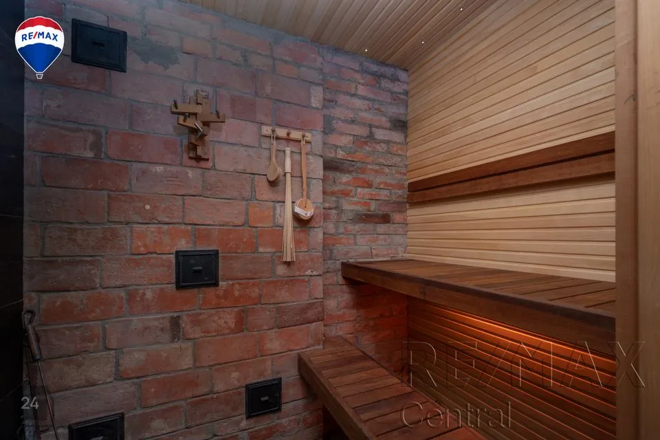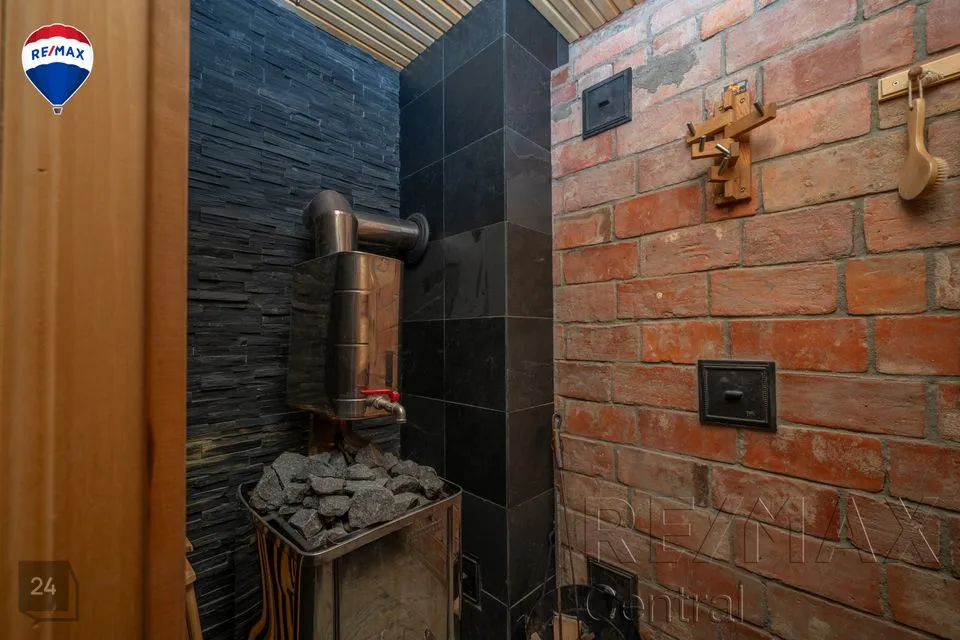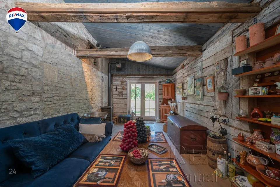 Kodu viimistluses on kasutatud kõrgekvaliteedilisi ja naturaalseid materjale, mis loovad luksusliku ja samas ajatu interjööri. Esimese korruse põrandaid katab elegantne must tammepuitparkett, vannituba on viimistletud eksklusiivse Rootsi rohelise marmoriga. Teisel korrusel on kasutusel vastupidav laminaatparkett ning vannitoas stiilne Teak-laevateki põrand. Seinapinnad on kaetud lubikrohviga, millele lisanduvad naturaalsed paekiviseinad ja osaliselt eksponeeritud palgid, pakkudes tekstuuri ja autentsust. Küttelahendusena on paigaldatud tõhus õhk-vesi soojuspump, mille toel toimib esimesel korrusel põrandaküte ja teisel korrusel radiaatorid. Hubasust lisavad puupliit soemüüriga köögis ning kamin-ahjud elutoas ja puhkeruumis. Lisaks tagab kaasaegne ventilatsioonisüsteem sisekliima stabiilsuse ja tervislikkuse aastaringselt.