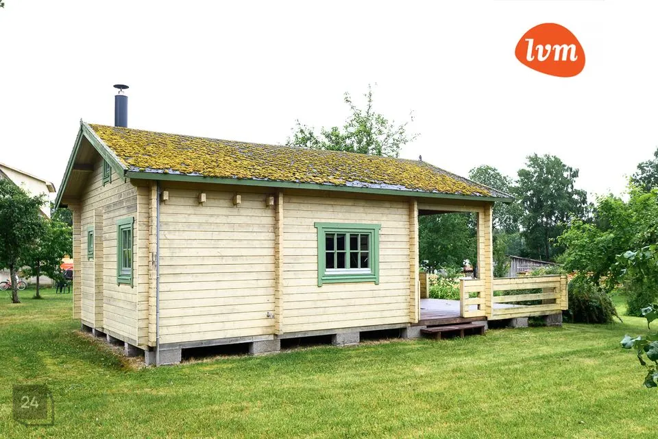 Saun-puhkemaja on ehitatud freespalkidest, seina paksus 70mm, puitaknad, mis valmistatud Haapsalu Uksetehases.