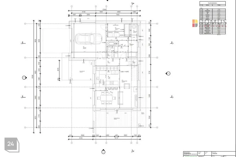 Esimene korrus: esik, avatud köök-elutuba, tualett, vannituba, leiliruum, tehniline ruum ja garaaž.