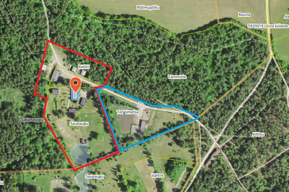 Müüdavad katastriüksused on Saueaugu, Keldri, Tonnimetsa. Viimasel pildil sinise joonega piiratud alast moodustatakse eraldi katastriüksus ja müügiga kaasa ei tule. Mõõdistamise töid juba teostatakse ja peaks lähiajal valmis saama.
