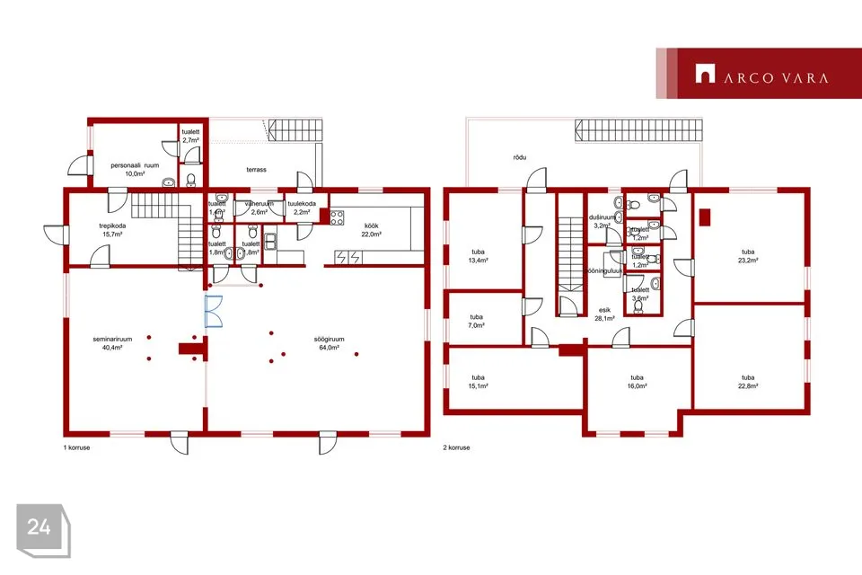 Külalistemaja suletud netopind on 304,7 m² (I korrus 155,4 m² ja II korrus 149,3 m²).