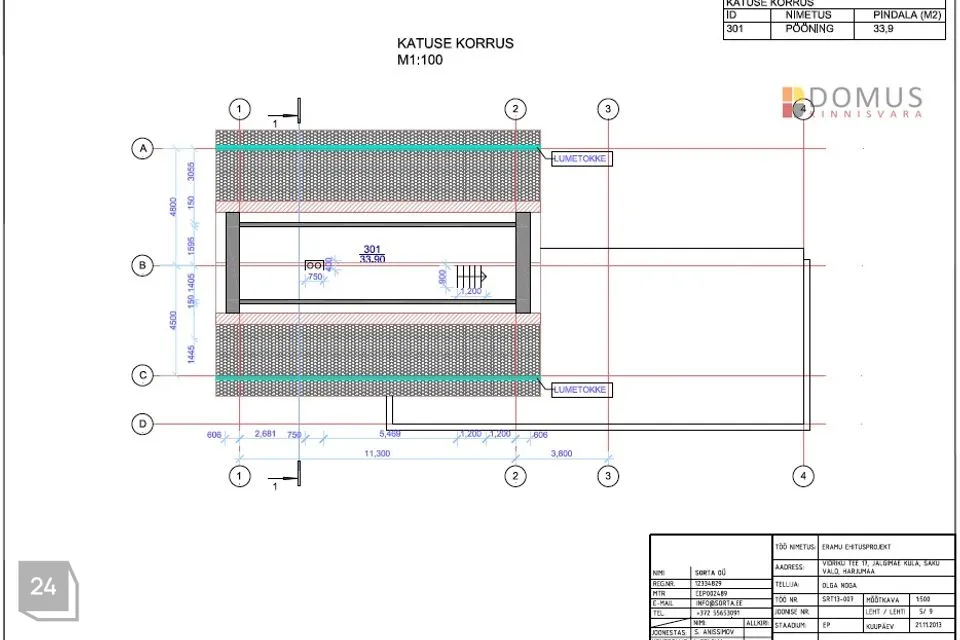 Ehituslahendus ja konstruktsioonid: plaatvundament, esimese ja teise korruse vahel Aeroc paneelid, välisseinad Aeroc Ecoterm Plus (500 mm) + 100 mm mineraalvilla (kokku 600 mm), mis tagab erakordse soojapidavuse. Siseseinad Aeroc. Katus: Ruukki Armorium profiilplekk – erilise disainiga ja vastupidav. Aknad: puit-alumiiniumraamidel 3-kordsed pakettaknad.