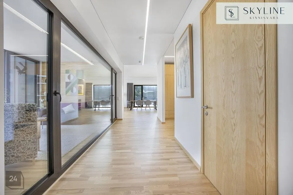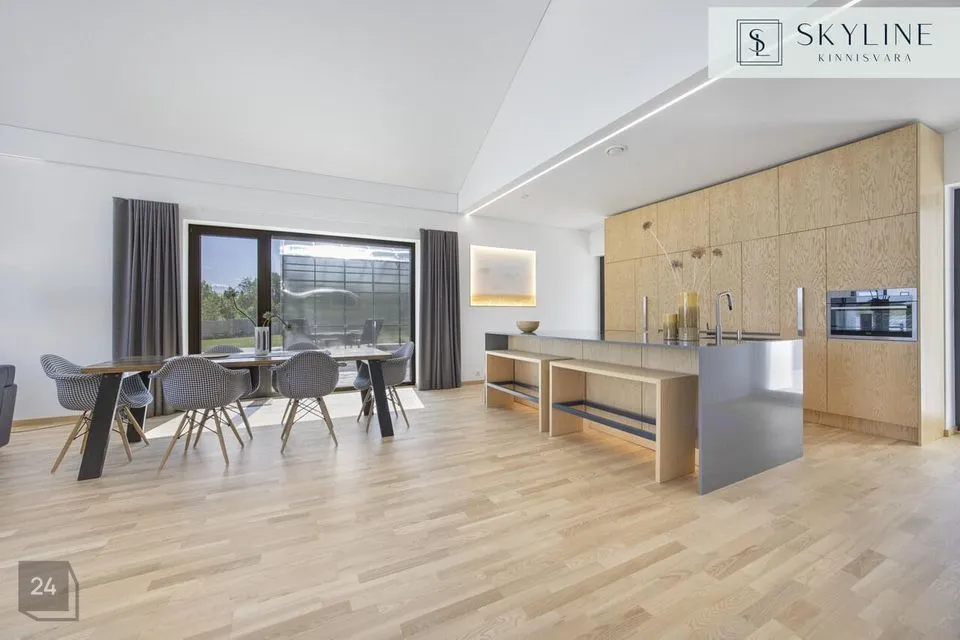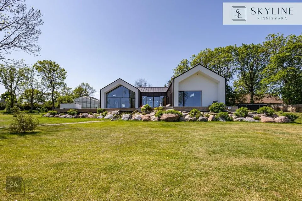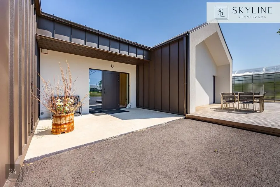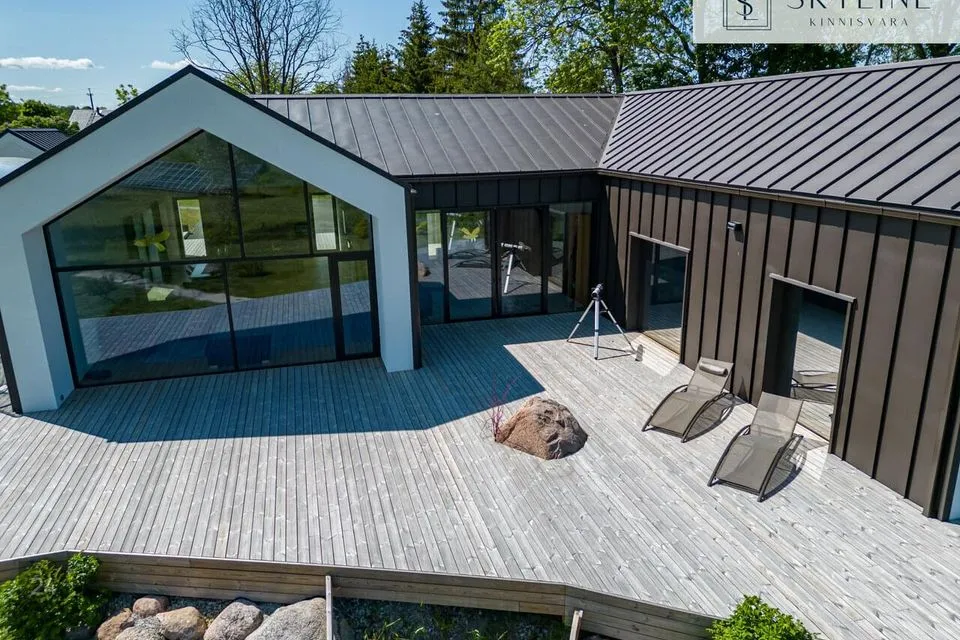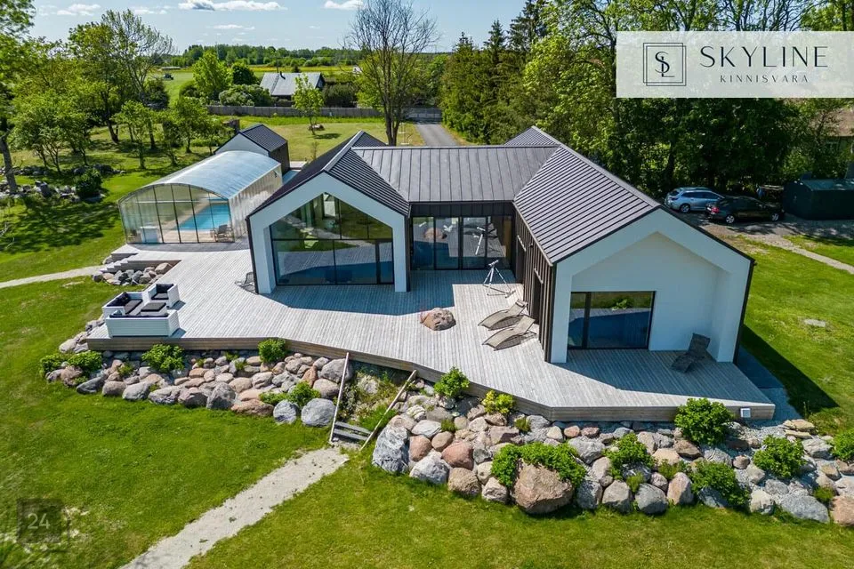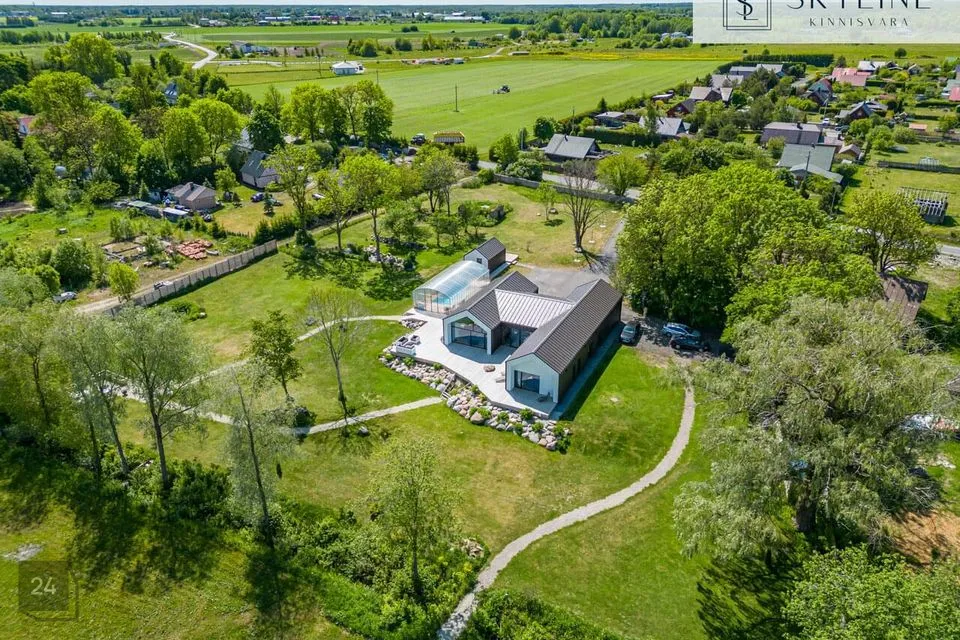 Selle erilise kodu kirjeldamist alustame peamajast, mis on selle kompleksi süda. Nutilukust avanevast välisuksest sisse astudes avaneb ees ruumikas esikugarderoob. Otse paistab soe talveaed, kust läbi kahepoolselt avatavate klaasuste pääseb ka avatud terrassile. Paremal pool maja asub avar elutuba-köök. Esikust vasakul asub kõigepealt eraldi tualett, millele järgneb soe garaaž. Koridorist edasi minnes on vasakul kodune kontor ja lisagarderoob, mis on lihtsasti magamistoaks ümbes kohaldatav. Edasi on vasakul külaliste magamistuba, pesumasina ja kuivatiga duširuum ning peamagamistuba koos suure eraldi garderoobiga. Peamagamistoast pääseb otse ka päikeselisele terrassile. Kõikidest ruumidest on võimalik astuda otse hoovi. Siinne kohtkinnitatud mööbel on eritellimusel saarepuidust tehtud, põrandaid katab naturaalne tammeparket ja hea soojapidavuse tagavad kvaliteetsed 3x klaasiga alumiiniumaknad. Kogu majas on LED-valgustid. Majast väljudes jõuame mööda terrassi otse sauna- ja basseinikompleksi. Eraldiasuvas saunamajas on mõnus õhksoojuspumbaga eesruum, duširuum ja elektrikerisega saun. Läbi tagaukse pääseb otse katusega kaetud 3x8m-suuruse basseini juurde, mida kütab eraldi soojuspump ja mille temperatuur on oma soovi järgi reguleeritav. Maja ja ka basseini- ja saunaala on ümbritsetud 350m2-suuruse terrassiga.