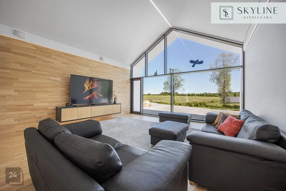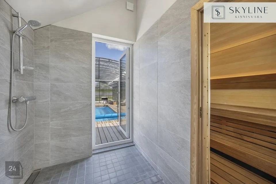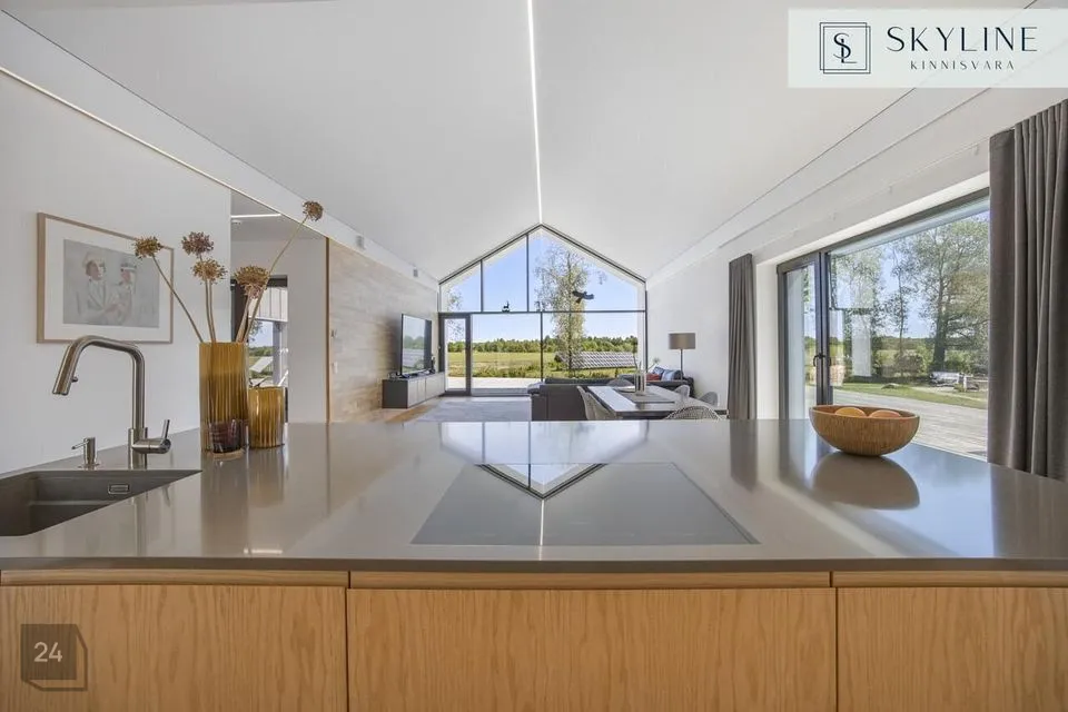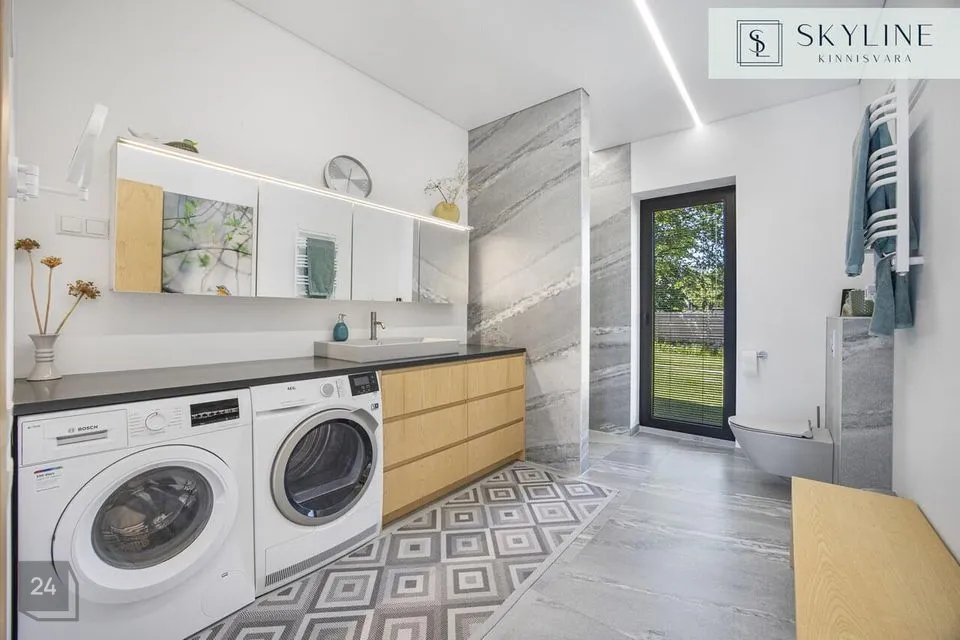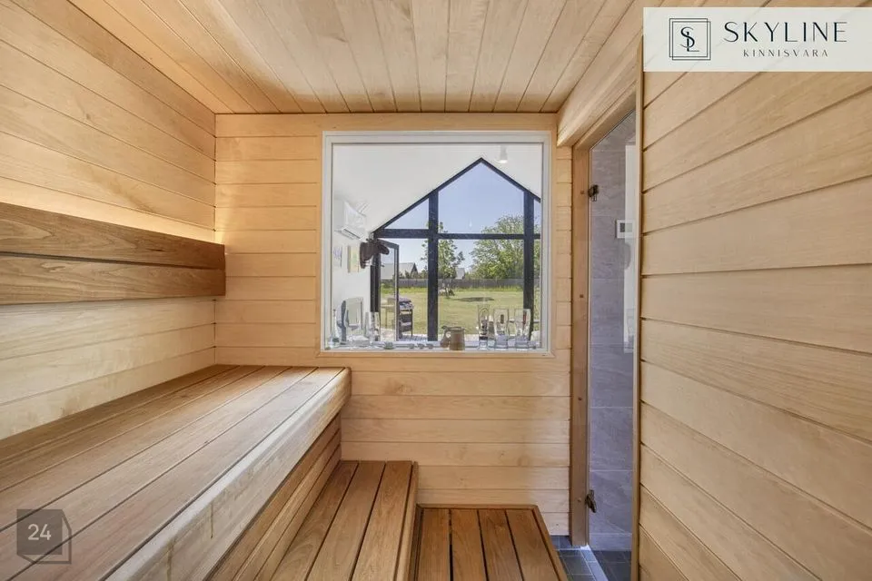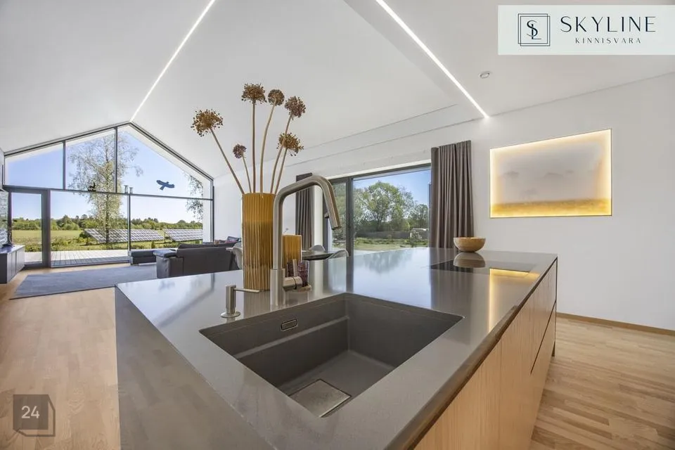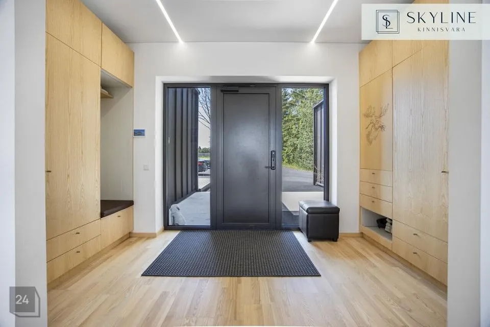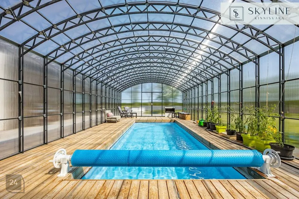 Selle erilise kodu kirjeldamist alustame peamajast, mis on selle kompleksi süda. Nutilukust avanevast välisuksest sisse astudes avaneb ees ruumikas esikugarderoob. Otse paistab soe talveaed, kust läbi kahepoolselt avatavate klaasuste pääseb ka avatud terrassile. Paremal pool maja asub avar elutuba-köök. Esikust vasakul asub kõigepealt eraldi tualett, millele järgneb soe garaaž. Koridorist edasi minnes on vasakul kodune kontor ja lisagarderoob, mis on lihtsasti magamistoaks ümbes kohaldatav. Edasi on vasakul külaliste magamistuba, pesumasina ja kuivatiga duširuum ning peamagamistuba koos suure eraldi garderoobiga. Peamagamistoast pääseb otse ka päikeselisele terrassile. Kõikidest ruumidest on võimalik astuda otse hoovi. Siinne kohtkinnitatud mööbel on eritellimusel saarepuidust tehtud, põrandaid katab naturaalne tammeparket ja hea soojapidavuse tagavad kvaliteetsed 3x klaasiga alumiiniumaknad. Kogu majas on LED-valgustid. Majast väljudes jõuame mööda terrassi otse sauna- ja basseinikompleksi. Eraldiasuvas saunamajas on mõnus õhksoojuspumbaga eesruum, duširuum ja elektrikerisega saun. Läbi tagaukse pääseb otse katusega kaetud 3x8m-suuruse basseini juurde, mida kütab eraldi soojuspump ja mille temperatuur on oma soovi järgi reguleeritav. Maja ja ka basseini- ja saunaala on ümbritsetud 350m2-suuruse terrassiga.