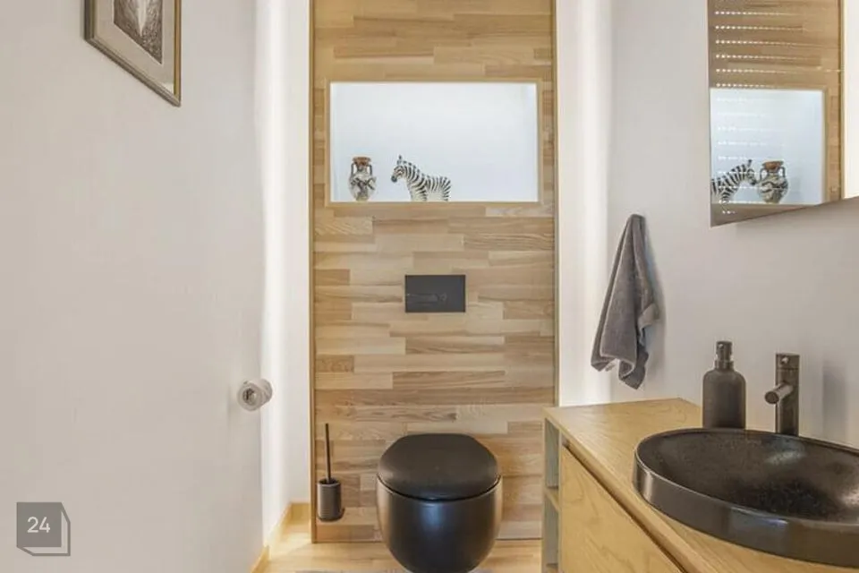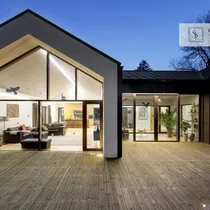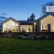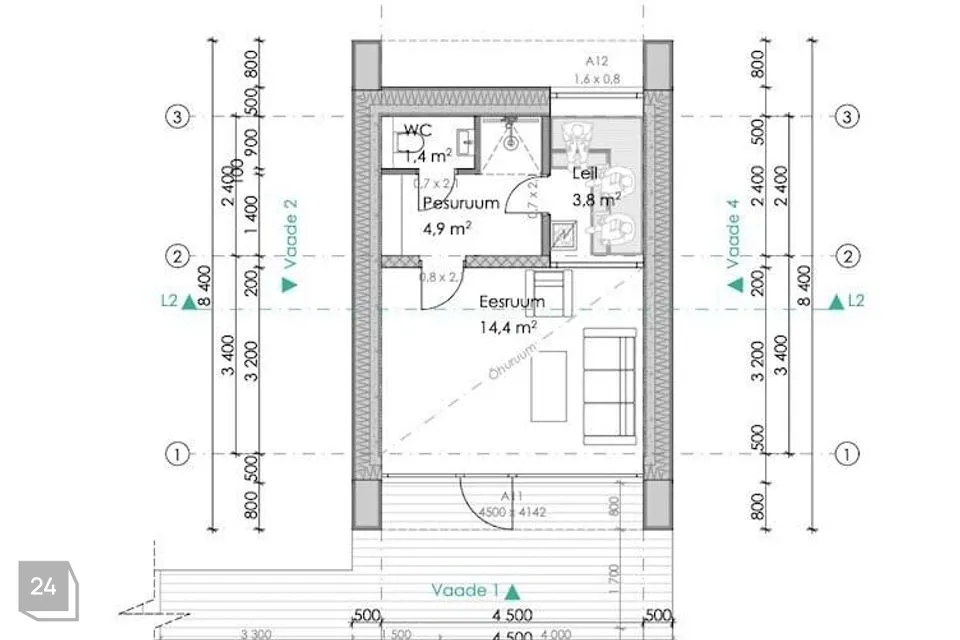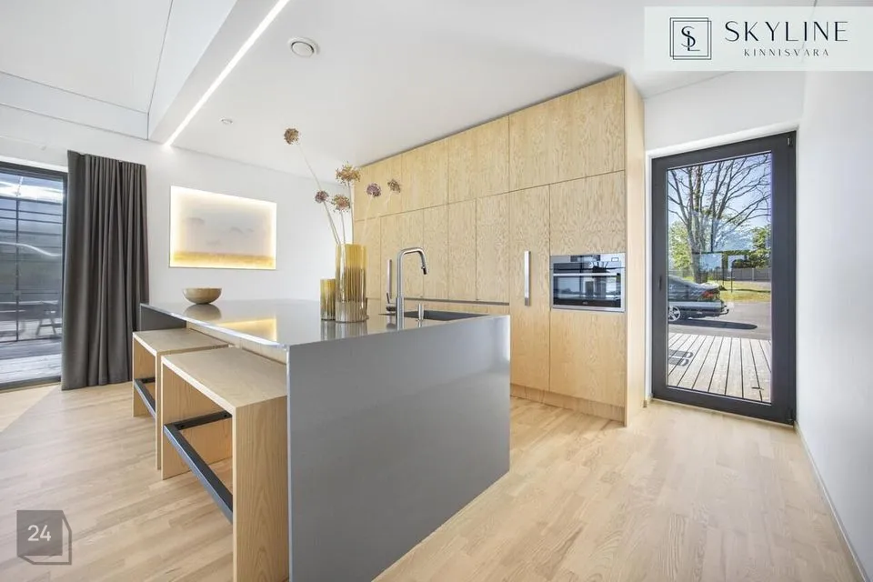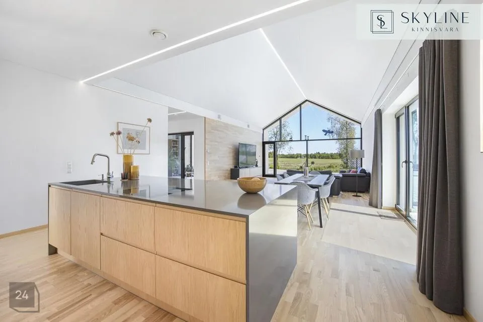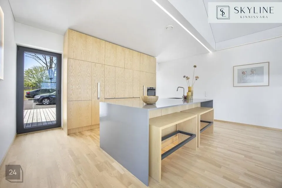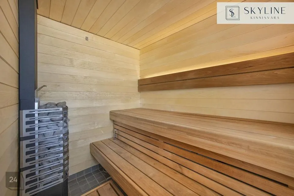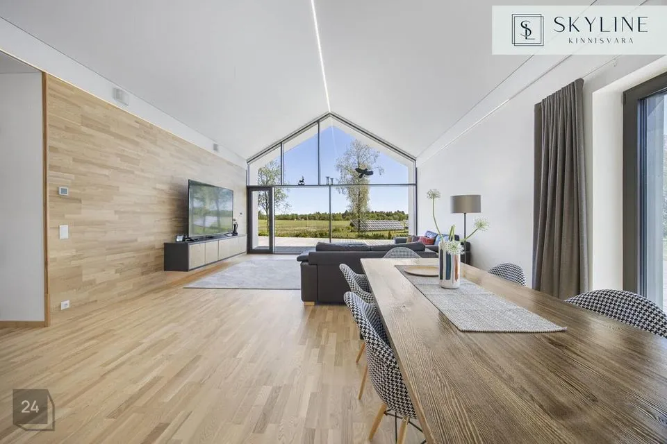 Selle erilise kodu kirjeldamist alustame peamajast, mis on selle kompleksi süda. Nutilukust avanevast välisuksest sisse astudes avaneb ees ruumikas esikugarderoob. Otse paistab soe talveaed, kust läbi kahepoolselt avatavate klaasuste pääseb ka avatud terrassile. Paremal pool maja asub avar elutuba-köök. Esikust vasakul asub kõigepealt eraldi tualett, millele järgneb soe garaaž. Koridorist edasi minnes on vasakul kodune kontor ja lisagarderoob, mis on lihtsasti magamistoaks ümbes kohaldatav. Edasi on vasakul külaliste magamistuba, pesumasina ja kuivatiga duširuum ning peamagamistuba koos suure eraldi garderoobiga. Peamagamistoast pääseb otse ka päikeselisele terrassile. Kõikidest ruumidest on võimalik astuda otse hoovi. Siinne kohtkinnitatud mööbel on eritellimusel saarepuidust tehtud, põrandaid katab naturaalne tammeparket ja hea soojapidavuse tagavad kvaliteetsed 3x klaasiga alumiiniumaknad. Kogu majas on LED-valgustid. Majast väljudes jõuame mööda terrassi otse sauna- ja basseinikompleksi. Eraldiasuvas saunamajas on mõnus õhksoojuspumbaga eesruum, duširuum ja elektrikerisega saun. Läbi tagaukse pääseb otse katusega kaetud 3x8m-suuruse basseini juurde, mida kütab eraldi soojuspump ja mille temperatuur on oma soovi järgi reguleeritav. Maja ja ka basseini- ja saunaala on ümbritsetud 350m2-suuruse terrassiga.