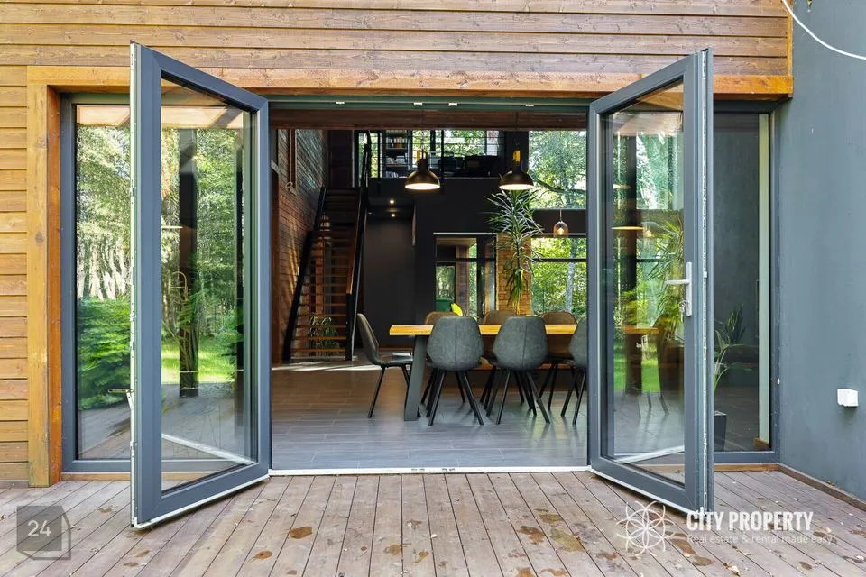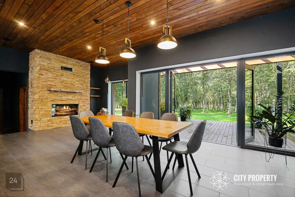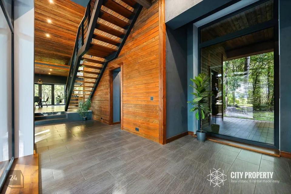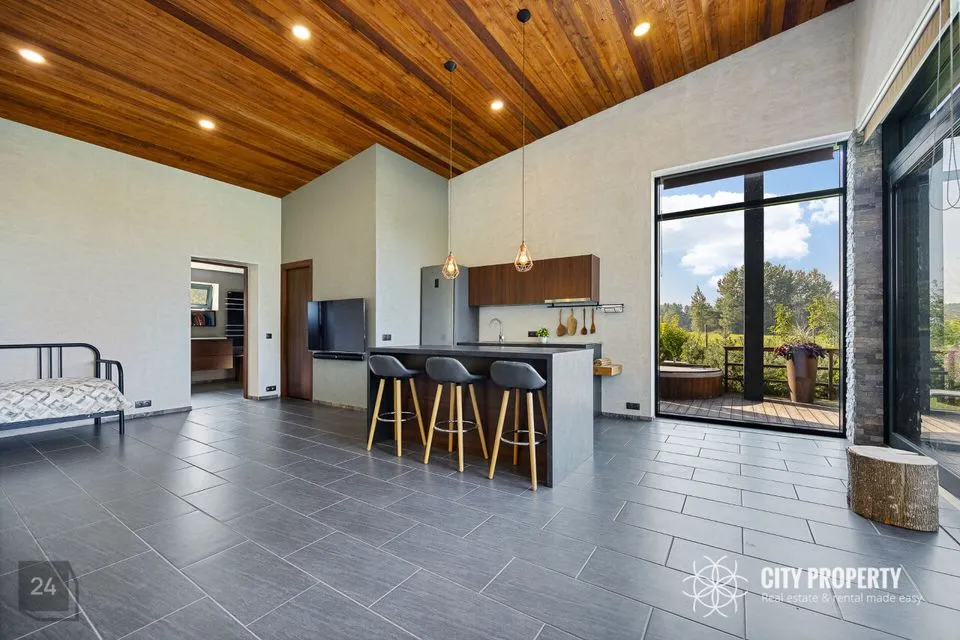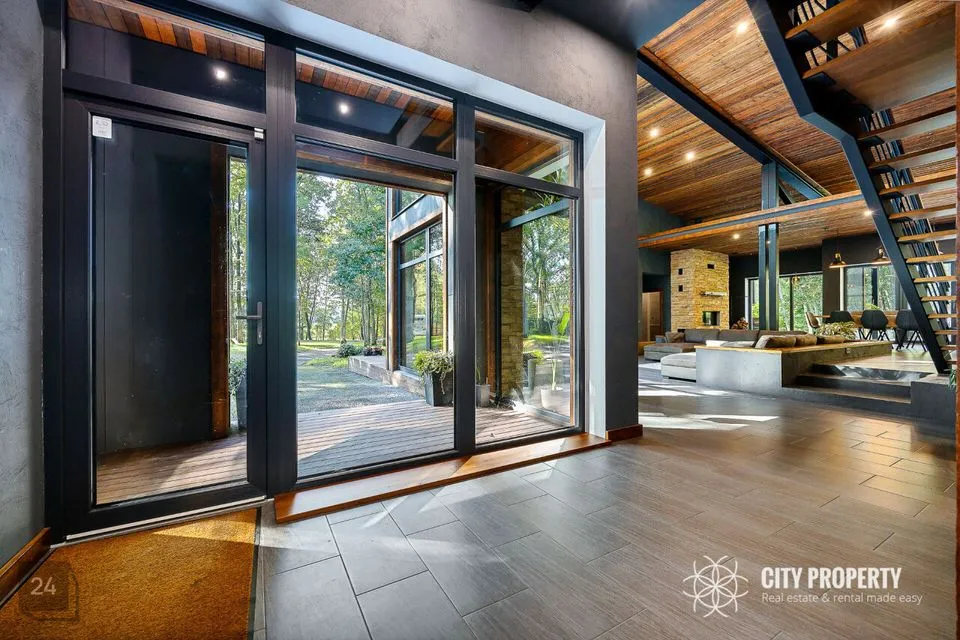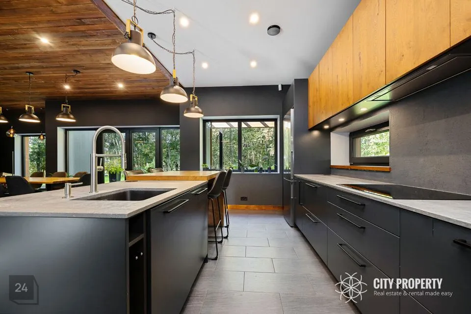 • Elutuba ja köök (61,6 m²): Muljetavaldavalt avar ja valgusküllane elutuba koos avatud köögiga. Maast laeni aknad avavad ruumi valgusele ning kõrged, 7,4 meetrised laed loovad suurejoonelise atmosfääri. Köögist pääseb otse terrassile, mis on ideaalne koht suvisteks grillõhtuteks ja perega aja veetmiseks.