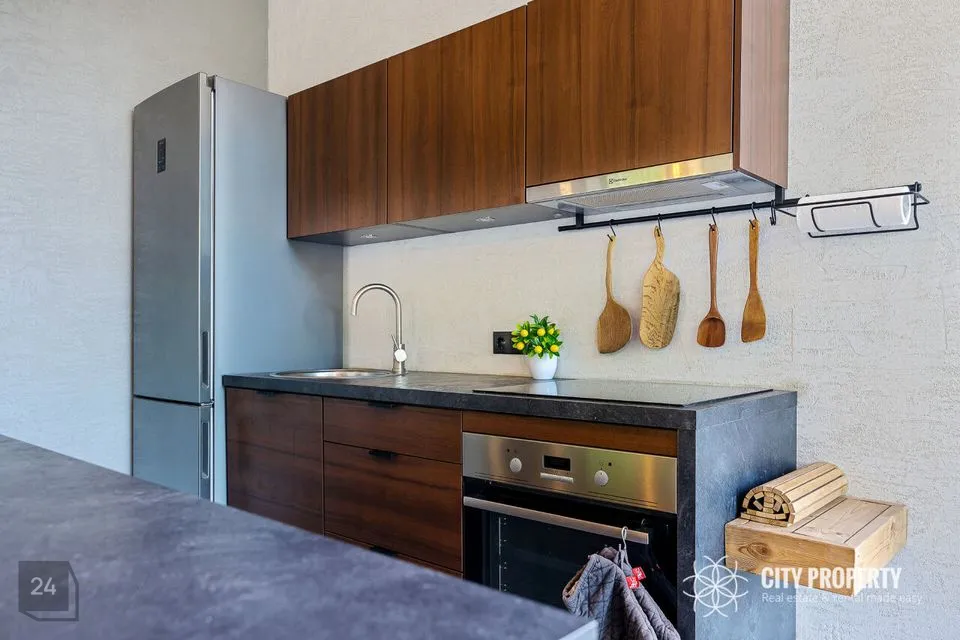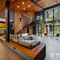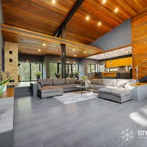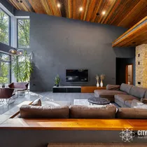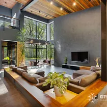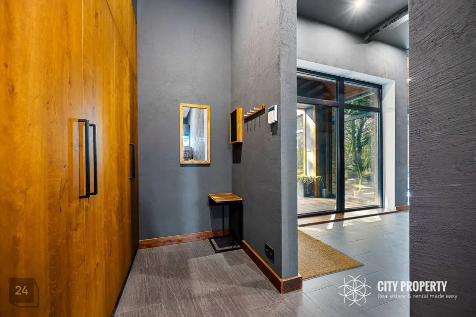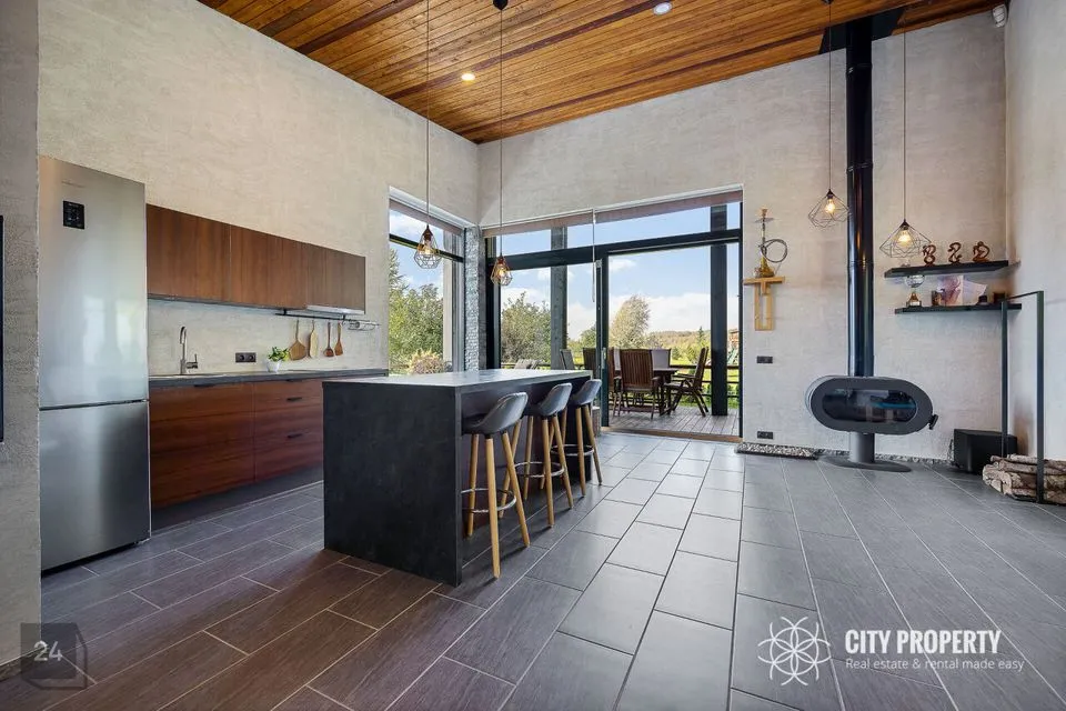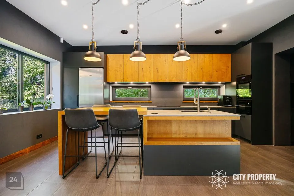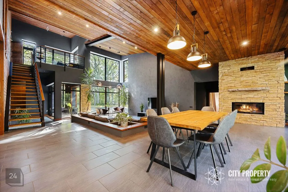 • Elutuba ja köök (61,6 m²): Muljetavaldavalt avar ja valgusküllane elutuba koos avatud köögiga. Maast laeni aknad avavad ruumi valgusele ning kõrged, 7,4 meetrised laed loovad suurejoonelise atmosfääri. Köögist pääseb otse terrassile, mis on ideaalne koht suvisteks grillõhtuteks ja perega aja veetmiseks.