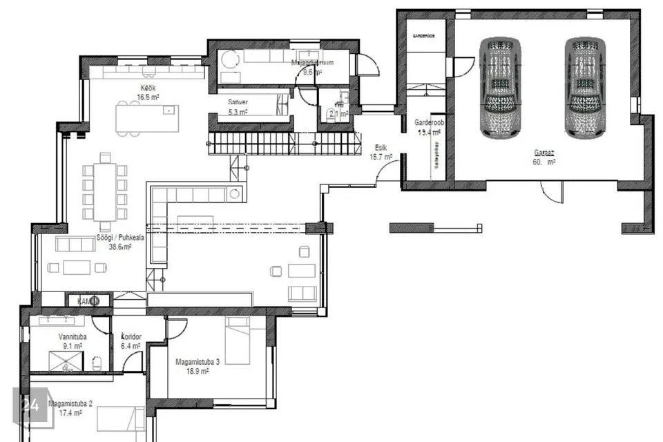 • Garaaž (60 m²): Ruumikas garaaž, mis mahutab kuni kolm sõidukit ja jätab piisavalt ruumi ka jalgrataste, tööriistade ja muude tarvikute jaoks.