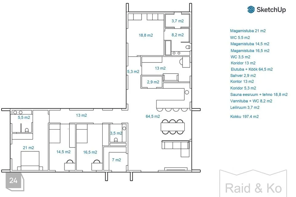 Elamu üldpind koos terrassidega on 335 m2, köetavat pinda 197 m2. Lagede kõrgus on planeeritud 2,7 m ja kõrged aknad ning siseuksed - 2,4 m.