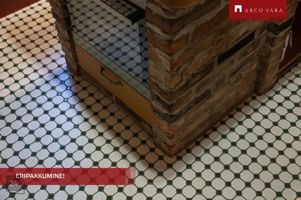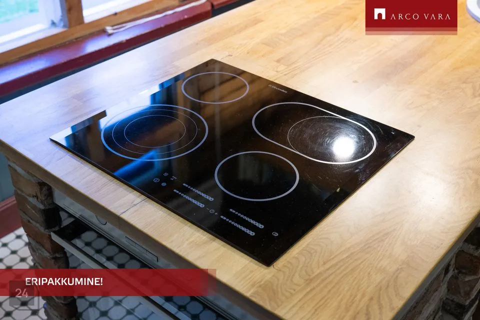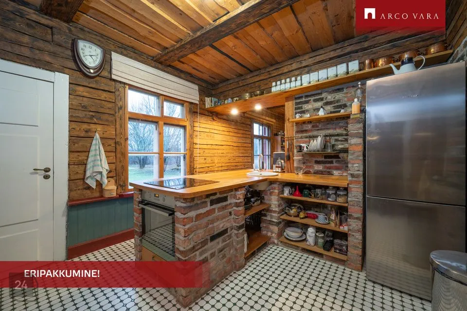 Avatud köögis on must– valge kahhelkivi põrand. Köögi töötasapind, kus on induktsioonpliit toetub tellistest laotud alusele, kuhu on paigaldatud praeahi. Valamu ja segisti on hästi kooskõlas kogu interjööriga. Köögis on ka puhvetkapp ja mahukas külmkapp. Puhvetkapi kõrval olevast uksest pääseb maja taha õue.