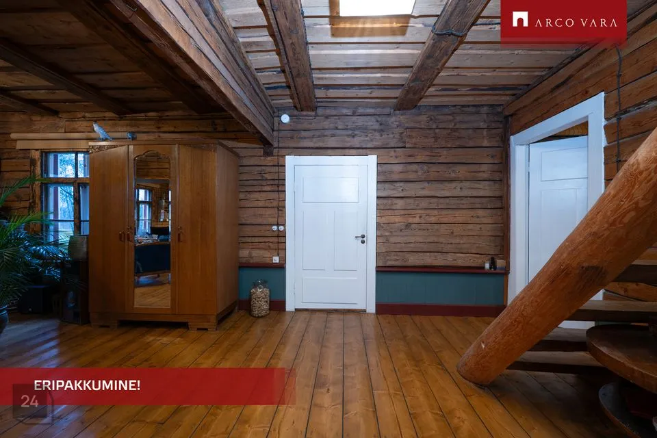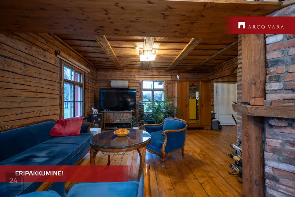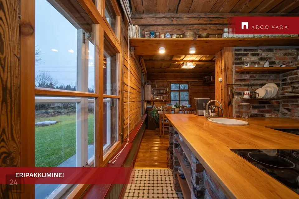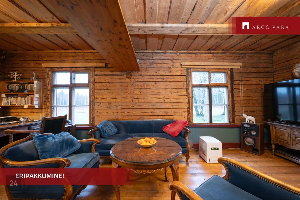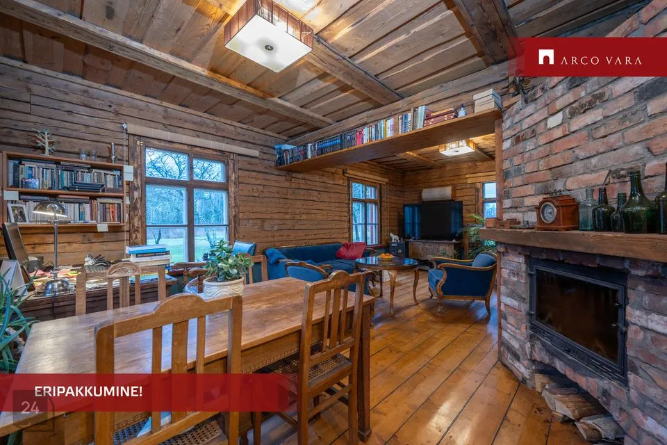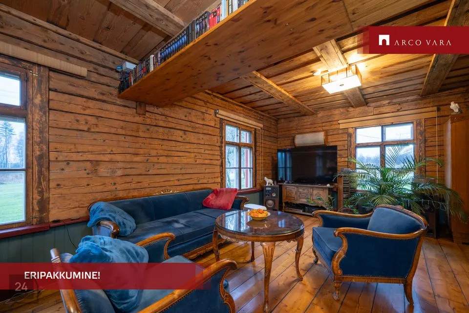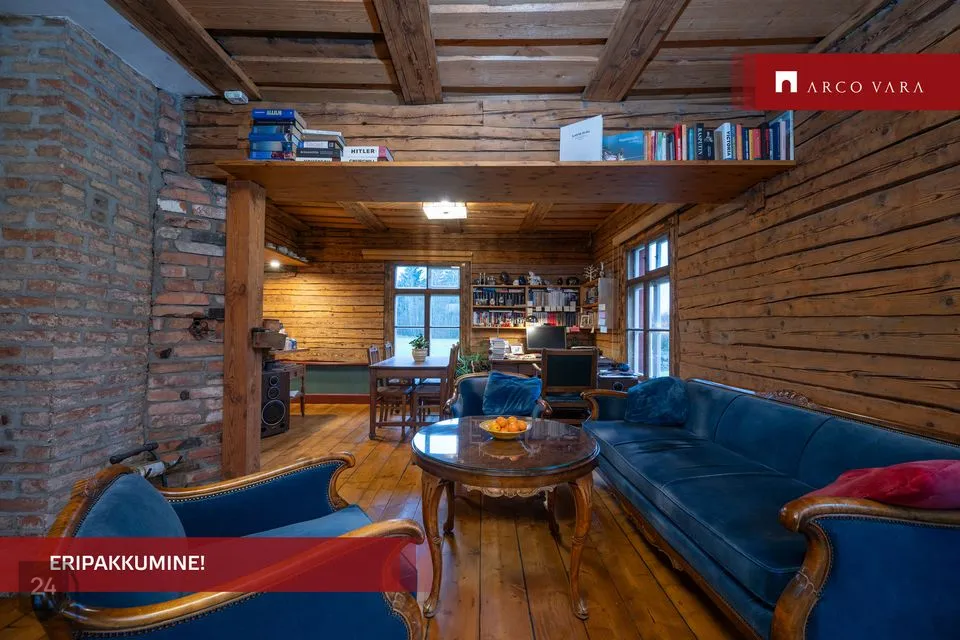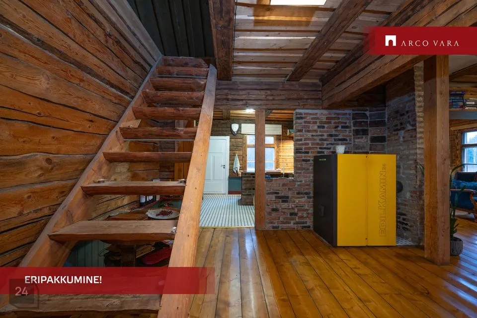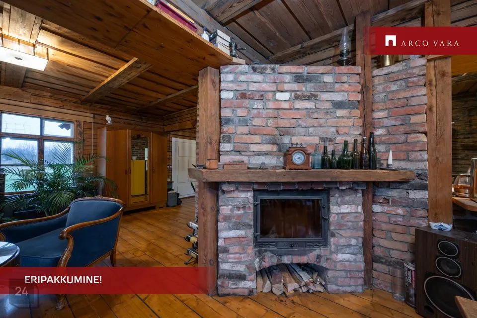 Liikudes esikust edasi leiad end avarast ruumist, mis ühendab elutuba ja kööki. Alumise korruse ruumid muudavad hubaseks õlitatud palkseinad ja vahelagi ning tugev puitpõrand, selle viimistlusega harmoneerub kogu mööbel ja sisustus: stiilne riidekapp, telekalaud, sametised diivan ja tugitoolid ning diivanilaud, mõnus kontori nurgake. Veelgi hubasemaks teeb ruumi keset tuba asetsev kamin.