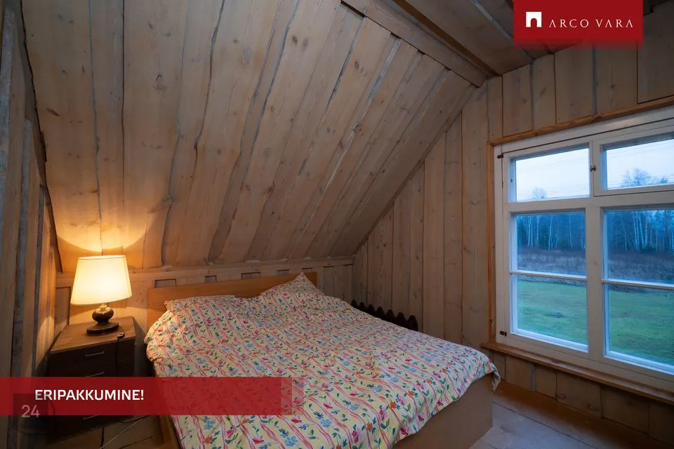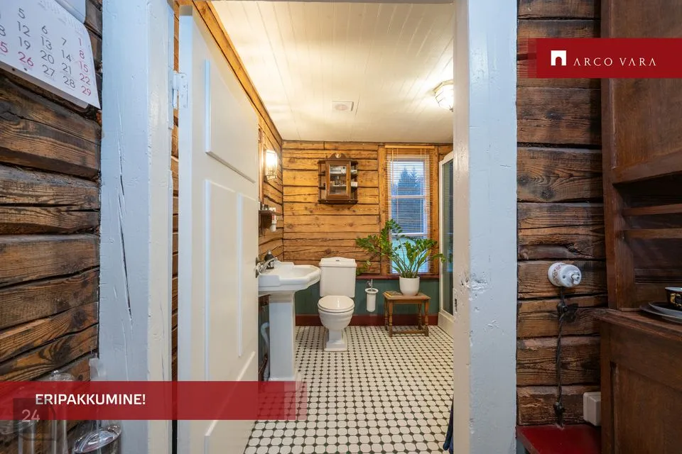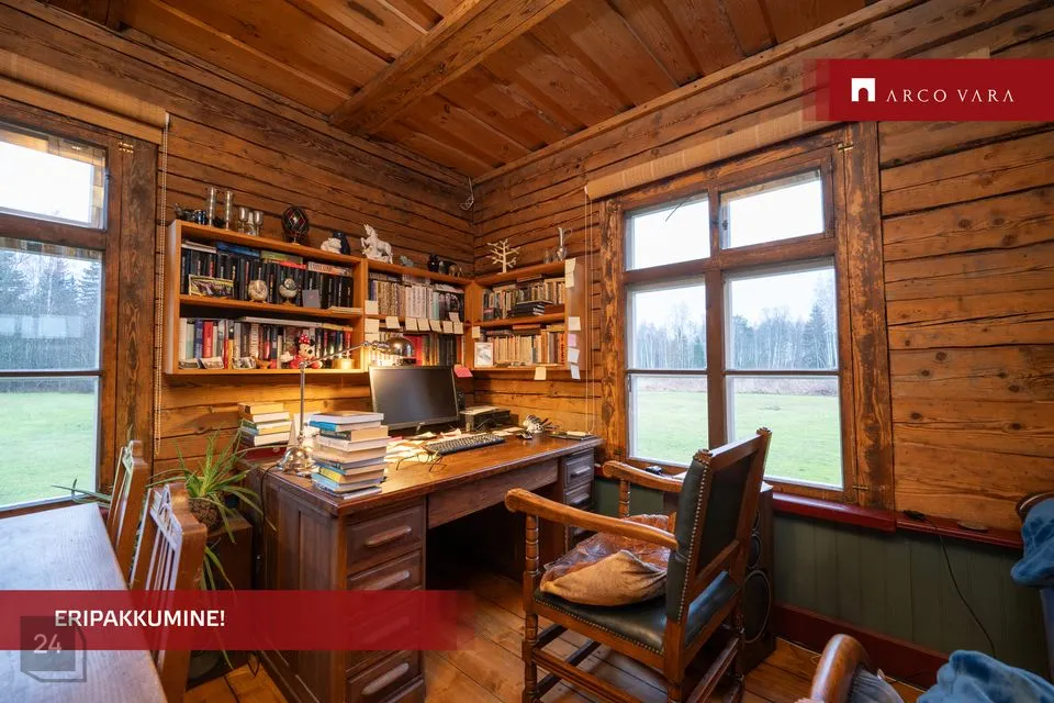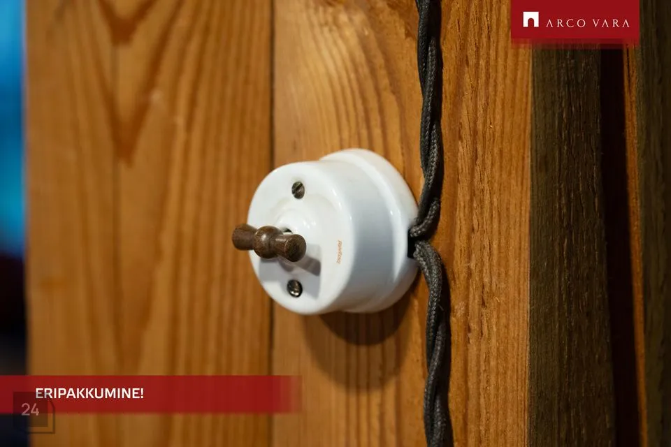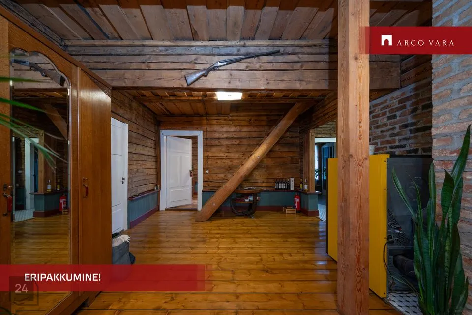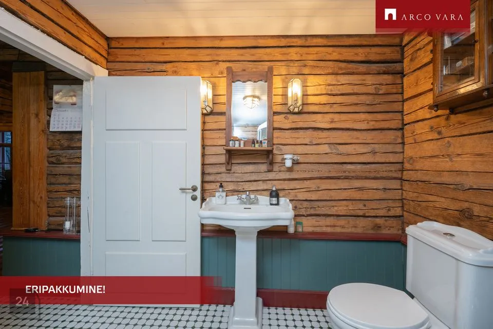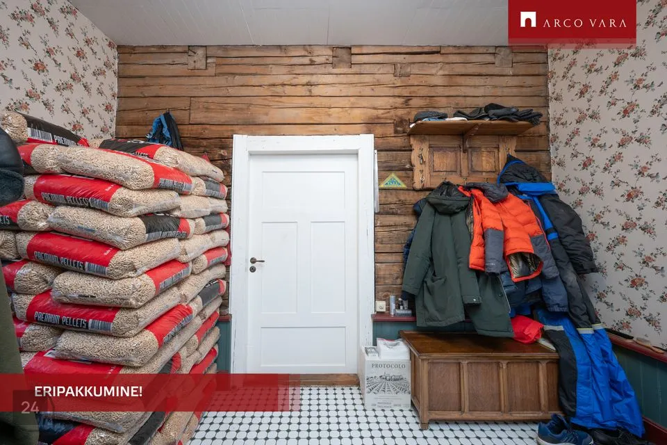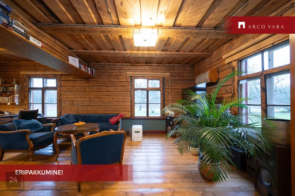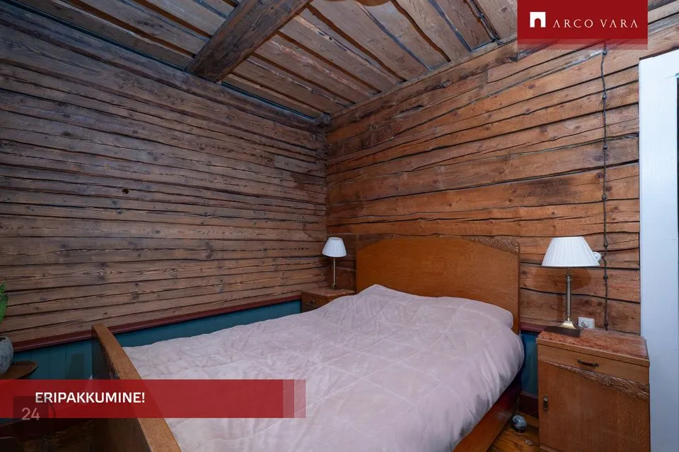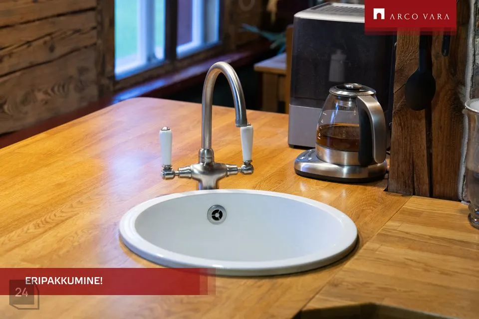 Liikudes esikust edasi leiad end avarast ruumist, mis ühendab elutuba ja kööki. Alumise korruse ruumid muudavad hubaseks õlitatud palkseinad ja vahelagi ning tugev puitpõrand, selle viimistlusega harmoneerub kogu mööbel ja sisustus: stiilne riidekapp, telekalaud, sametised diivan ja tugitoolid ning diivanilaud, mõnus kontori nurgake. Veelgi hubasemaks teeb ruumi keset tuba asetsev kamin.