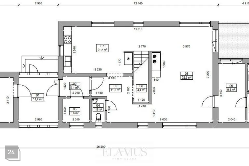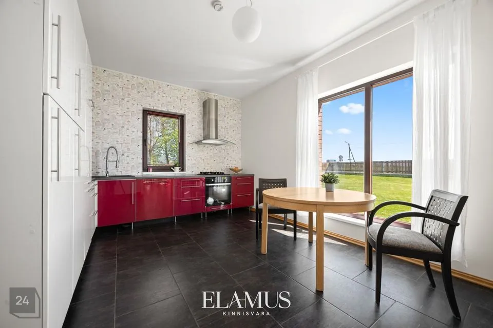 - Open-plan kitchen where every detail is placed according to the housewife's wishes – kitchen furniture, gas stove, electric oven, dishwasher, refrigerator, plenty of work surface, natural light from all sides.