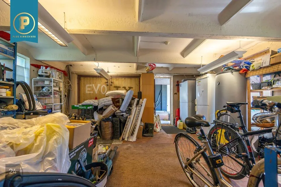 Maja teise poole alumisel korrusel asub avatud köök, suur elutuba, saun, wc, pesuruumid ja kanaliga garaaž. Garaazis asub ka õhk-vesi soojuspump ning boiler. Garaazist pääseb keldrisse, kus on garaažialune tööruum/kelder 33,52m2 ja veel üks suurem panipaik 21m2 ning eraldi kolm hoidiste hoiustamise ruumi, iga ruum 7m2. Kogu keldriosa pindala on 75,27m2. Esimese poole majaosa all on kelder 25m2, kus on katlaruum tahkeküttekatlaga, mis on küttesüsteemiga ühendatud, kuid mida pole mitmeid aastaid kasutatud. Lisaks on varjualune auto parkimiseks.