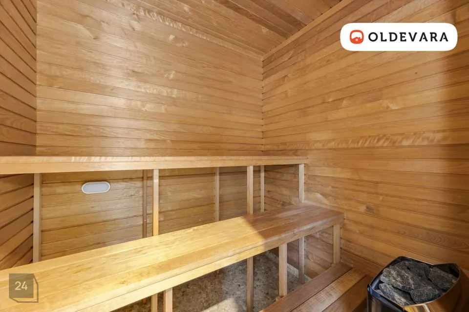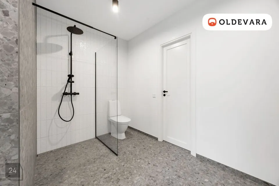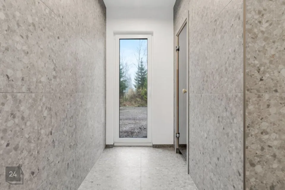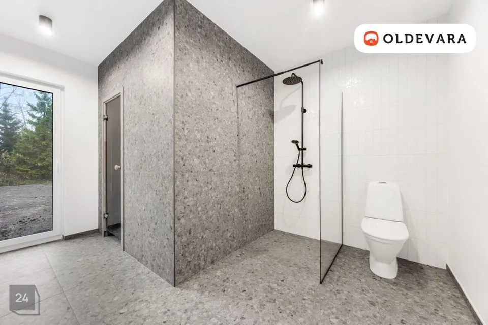 The bathroom and WC are located in one room, featuring a shower corner with glass wall, toilet, and an electric sauna stove, with direct access to the back of the house. The house has a separate walk-in closet/storage room, which has water and sewage connections prepared, allowing for the construction of a second utility room or WC if desired. Technical systems are located in a separate technical room with its own entrance.
