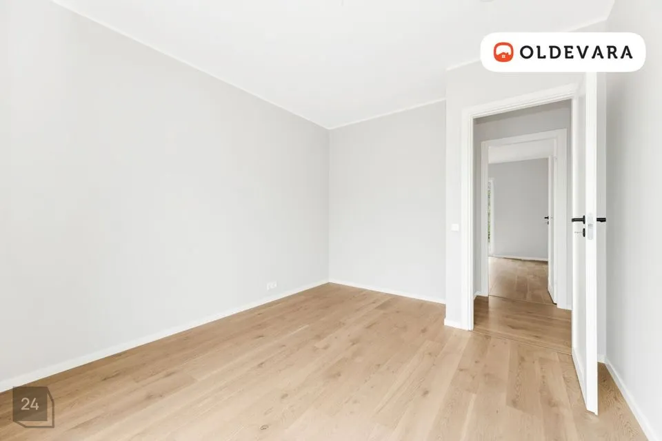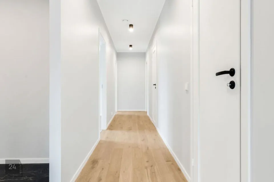Interior finishing uses single-strip oak parquet, light neutral tones, and large-format tiles in the hallway and wet rooms.