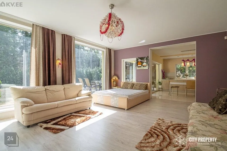 Valgusküllane kaminaga elutuba 32,2 m2 avatud köögi ja söögitoaga 22,1 m2, pääsuga päikeselisele terrassile 37,6 m2.