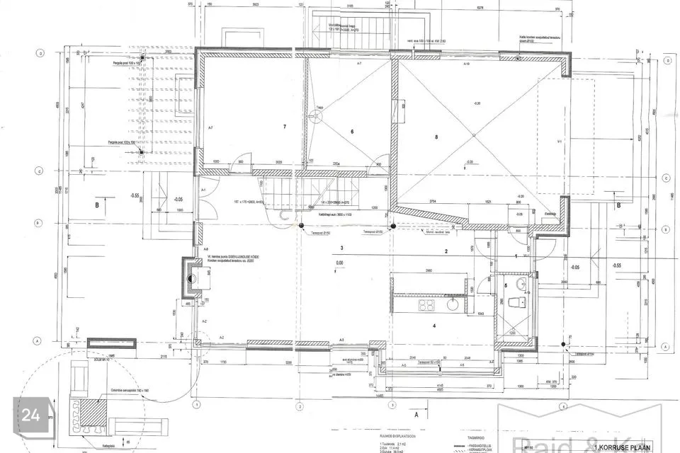 I korruse koosseisu kuulub tuulekoda, esik, elutuba pääsuga terrassile, köök, kabinet, WC ja duširuum, suur majapidamisruum ning garaaž kahele autole.