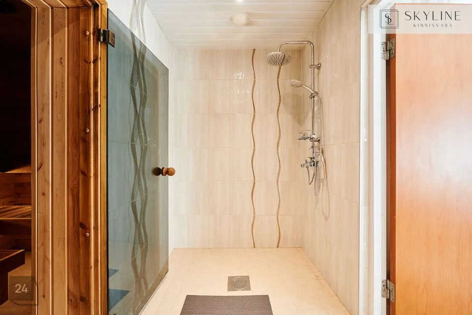 Arnika tee 113 maja on L-kujulise ülesehitusega. Sisenedes avaneb eest kõigepealt suur esik. Otse ja vasakule jääb osaliselt avatud elutoa ja köögi ala, kus on palju valgust ja avarust ning kõrged laed, mis lisavad luksuslikku tunnet. Paremale jääb kolm magamistuba, tualettruum, vannituba ning suure eesruumiga saun. Nii elutoas kui saunaeesruumis on kamin. Saun on puukerisega. Värskelt üleni renoveeritud luksusliku siseviimistlusega maja on möbleeritud. Lisaks on siin eraldi sissepääsuga ala, kus on tualett, duširuum, väike köök ning üks tuba. Kokku on majas kolm duširuumi ja kolm tualetti. Soovi korral on eraldiseisev osa võimalik ka siseruumidega ühendada. Eraldi sissepääsuga õuest asub ka tehnoruum/katlamaja.