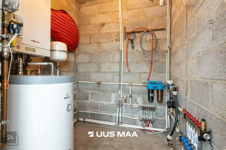 • Efektiivne gaasiküte, vesipõrand baasil I korrusel ja radiaatorite baasil II korrusel, iga ruum eraldi reguleeritav. Elutoas ka hubasust loov õhkkütte kamin. Majas keskne sundventilatsioon.
