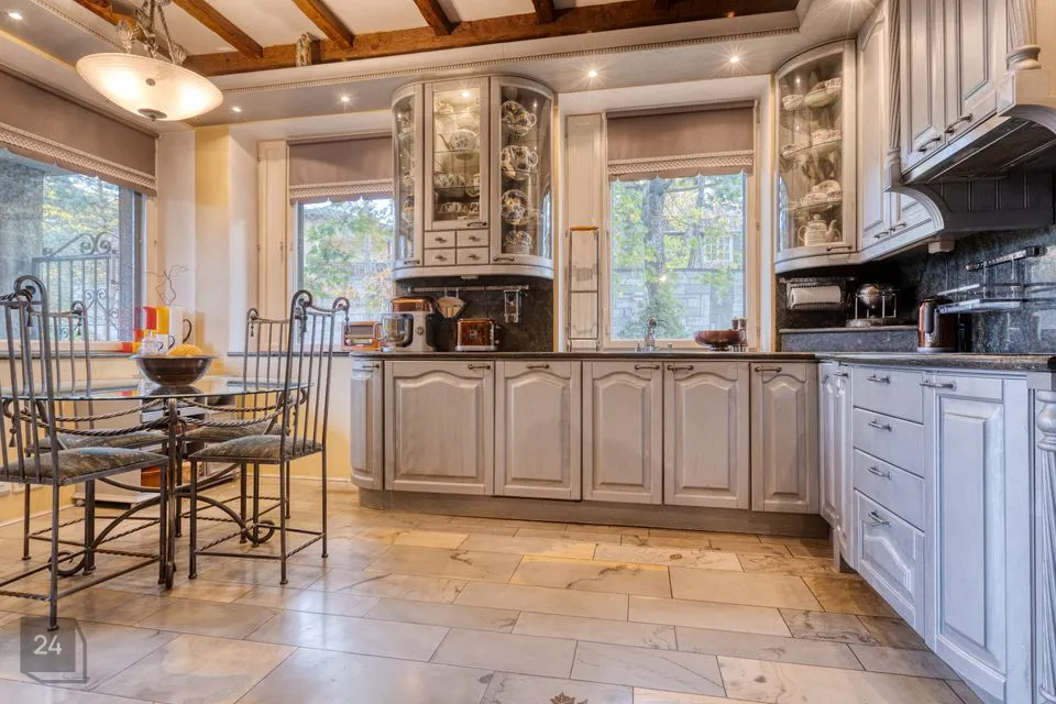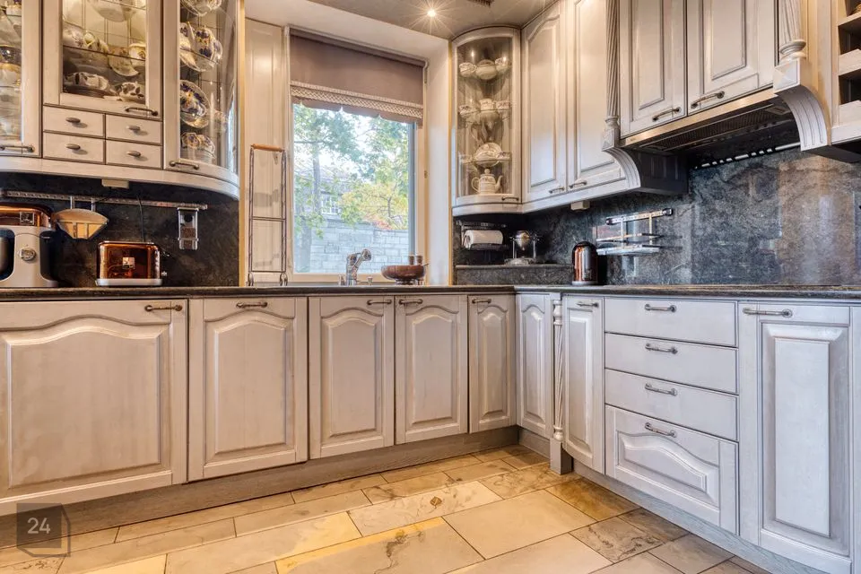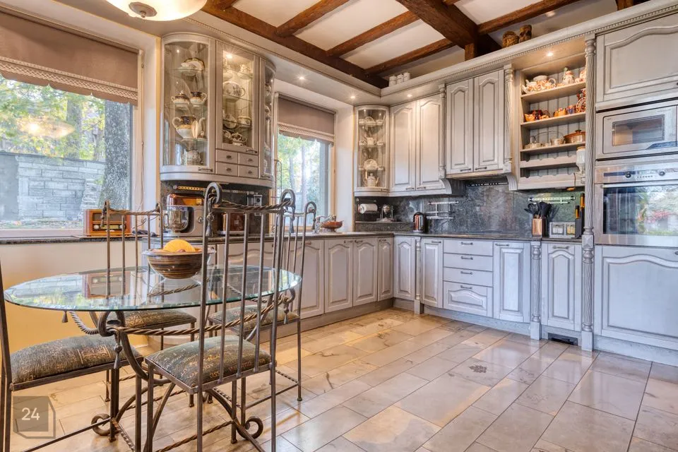 Elutoamööbel (Vene ampiir Biedermeier mahagonist), mis pärineb 19. sajandi algusest, on restaureeritud ja väga heas korras. Söögitoa mööbel (Vene modern tammepuidust) pärineb umbest 1900. aastast. Köögimööbel on valmistatud eritellimusel kvaliteetsest tammepuidust, tööpind graniidist, põrand kohalikest paekiviplaatidest. Köögi- ja kodutehnikast on olemas külmkapp, sügavkülm, mikrolaineahi, küpsetusahi, pliit, nõudepesumasin, pesumasin ja väljatõmmatav triikimislaud.