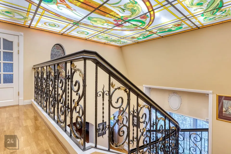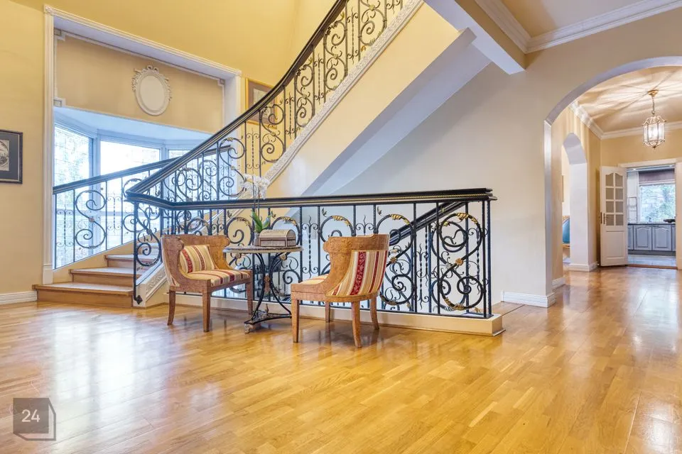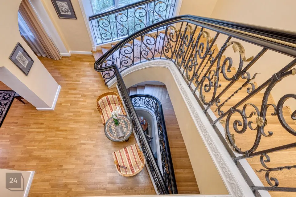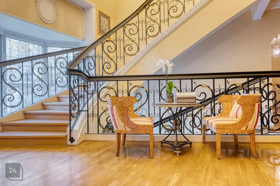Kogu 3-korruselist majaosa läbib käsitööna valmistatud tammepuidust astmete ja sepistatud käsipuuga trepp. Uksed on samuti täispuidust ja eritellimusel valmistatud ning põrandaid katab Rootsi tammeparkett.