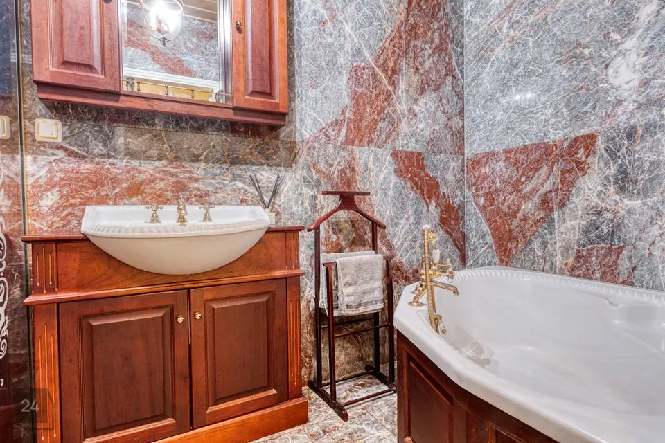 Vannitoad on kõik eritellimusel tehtud suurtest marmorplaatidest, santehnika firmalt Heritage.