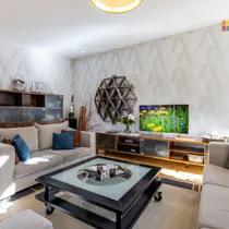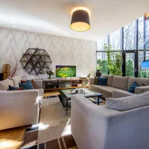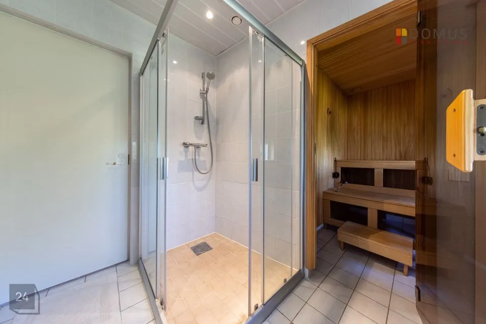 Eluruumide põrandaid katab kvaliteetne tammeparkett. Laed on valged ja seinad on värvitud või kaetud tapeediga. Vannitoa ning WC-de seinad ja põrand on plaaditud. Leiliruumis on elektrikeris ja pesemisruumis klaasseintega dušinurk ja mullivann. Köögis tehnika osas on paigaldatud ahi ja pliit, õhupuhasti, nõudepesumasin ja kaks sügavkülma osaga integreeritud külmkappi. Garaaži põrandal on sile epoksükate.