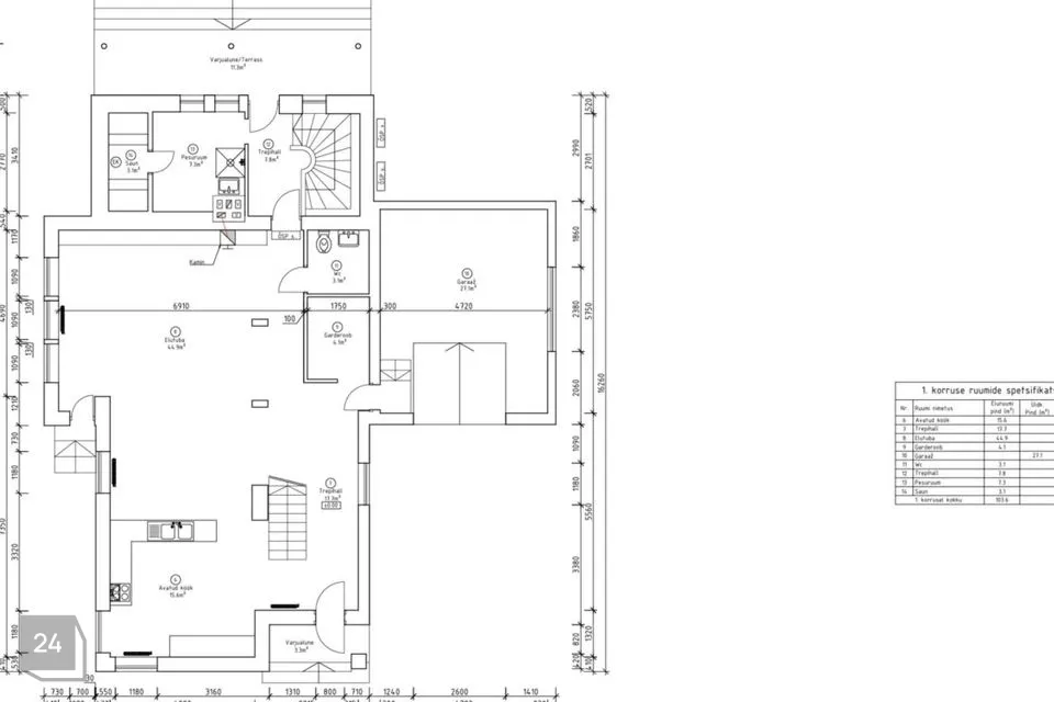 Peahoone esimesel korrusel asub: tõeliselt ruumikas elutuba suurusega 44,9 m², avatud köök 15,6 m², tualett, garderoobi nurk, pesuruum, garaaž 27,1 m² ning terrass ca 42 m².