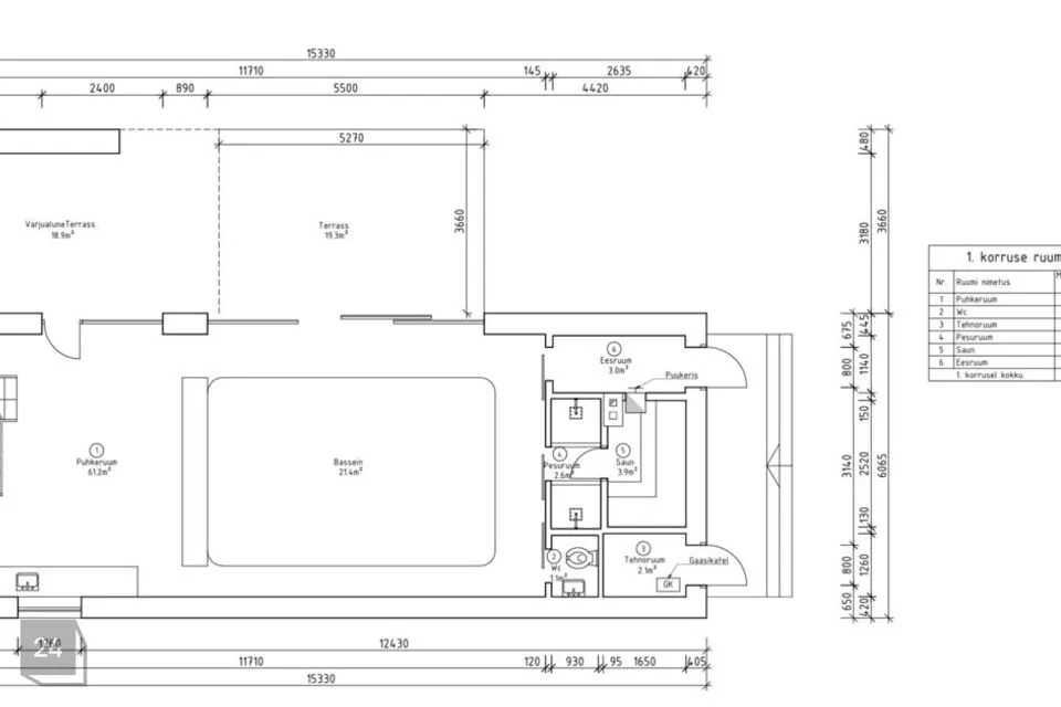 Puhkeruum koos integreeritud köögiga, bassein, tualett, dushiruum, puuküttega saun ning ca 38 m² terrass.