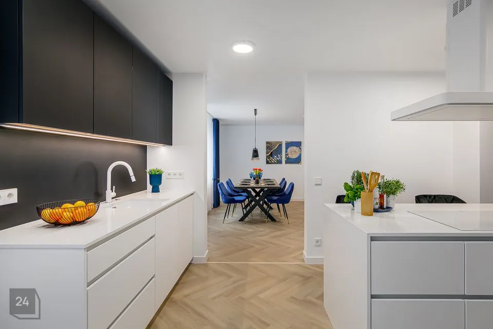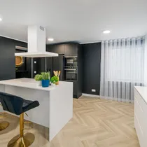 • Disainköök kivitasapindade ja saarega, kvaliteettehnikaga (sh kahekordne külmik, lai induktsioonpliit, Faberi kubu, integreeritud mikrolaine- ja küpsetusahi ning nõudepesumasin)