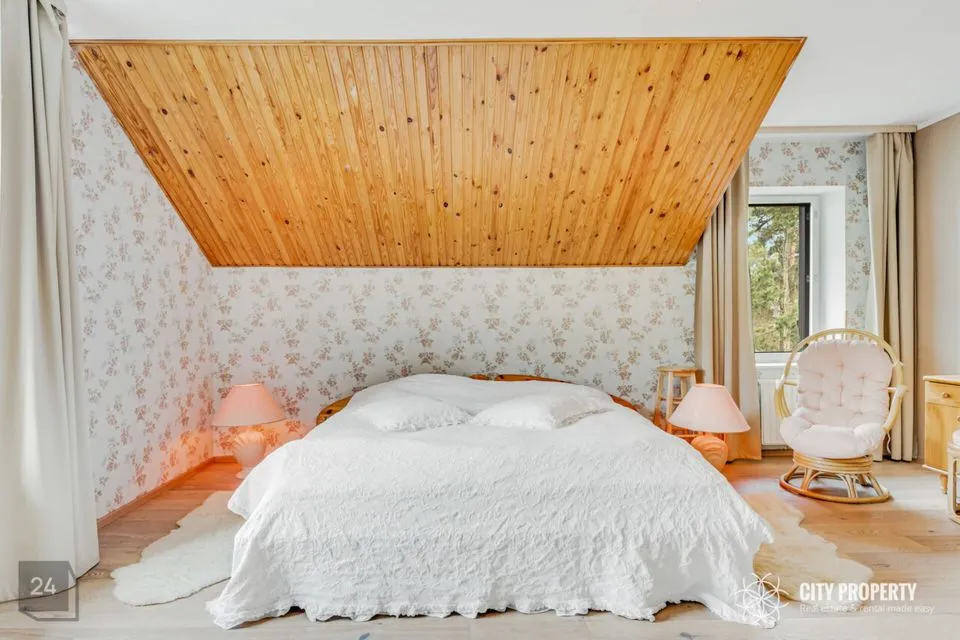 Maja teisel korrusel asuvad kolm eraldi asetsevat magamistuba ning wc/vannituba. Avaras ja päikselises suures magamistoas asub walk-in garderoob ning siit pääseb ka privaatsele rõdule. Vajaduse korral on võimalik see tuba jagada kaheks eraldi ruumiks. Rõdult on võimalik pääseda maja katusealusesse, kus on näha lae soojustust, 60 cm puistvilla.