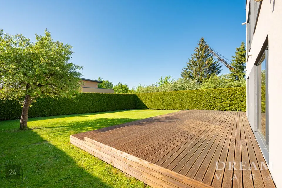 Maja taga asub õhtupäikesele avatud terrass, mis on rajatud korralikule vundamendile. Kinnistu on piiratud hästi hooldatud elupuuhekiga. Muru hooldab robot muruniiduk. Värav avaneb puldiga. Suureks lisaväärtuseks on autovarjualune kahele autole. Maja ette on paigaldatud kiviparkett. Eramule on väljastatud kehtiv kasutusluba.