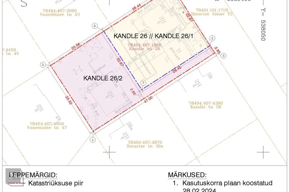 Kandle 26 kinnistu on jagatud notariaalse kasutuskorraga, millest Kandle 26/2 juurde kuulub 600 m².