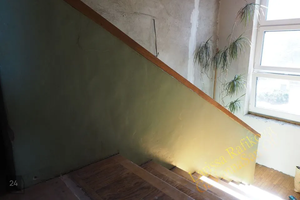 Лестница на второй этаж уникальная, бетонная, покрыта паркетом.