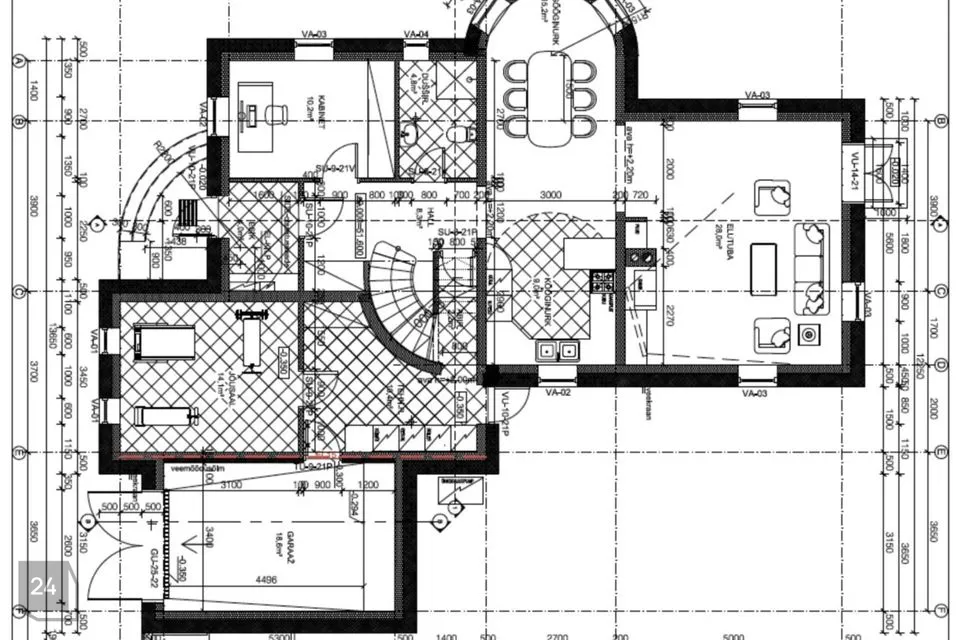 Eramu ehitus ja viimistlus on lahendatud kvaliteedile keskendudes: FIBO-plokkidest välisseinad toetuvad kestvale lintvundamendile, mille betoonvalu all on 300 mm EPS soojustus, ning katuselagi on soojustatud 450 mm villaga, see tagab väga hea soojapidavuse ja madalad kulud. Kolmekordsed puitpakettaknad parandavad nii energiatõhusust kui ka mürasummutust, krohvitud fassaad ja looduskiviga viimistletud sokkel annavad majale ajatu ja väärika ilme. Siseruumides loovad kergbetoonplokkidest siseseinad ja monoliitbetoonist vahelagi tugeva, püsiva konstruktsiooni, mille keskseks aktsendiks on skulptuurne betoonist keerdtrepp massiivsete tammepuidust astmetega. Põrandatel kasutatud massiivne tammelaud ja disain klinkerplaadid toovad interjööri loomuliku soojuse ja vastupidavuse, sidudes tehnilise täpsuse ja esteetilise terviku.