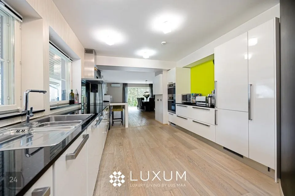 441 m² maja on luksuslik ja läbimõeldud planeeringuga. Selle kodu märksõnadeks on avarus ja valgus. Elamu projekteeris tunnustatud arhitekt Meeli Truu aastatel 1997–2000. 2012. aastal viidi läbi põhjalik sisekujunduslik uuendus, kasutades kõrgekvaliteedilisi materjale, luues ajatu ja stiilse kodu. Seinad on Fibo plokkidest, fassaad kaetud elegantse Marmoroc kattega.