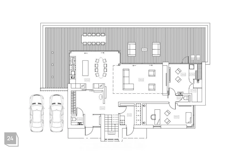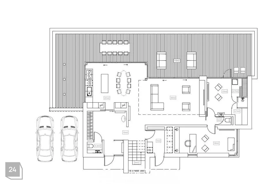 Eramu on planeeritud ilmakaari arvesse võttes – põhjapoolsesse osasse jäävad esik ja enamik abiruumidest. Läbi kahe korruse asuv avatud õhuruumiga elutuba ja terrass avaneb lõuna-lääne suunal, lastetoad ja köök avanevad hommikupäikese suunal.