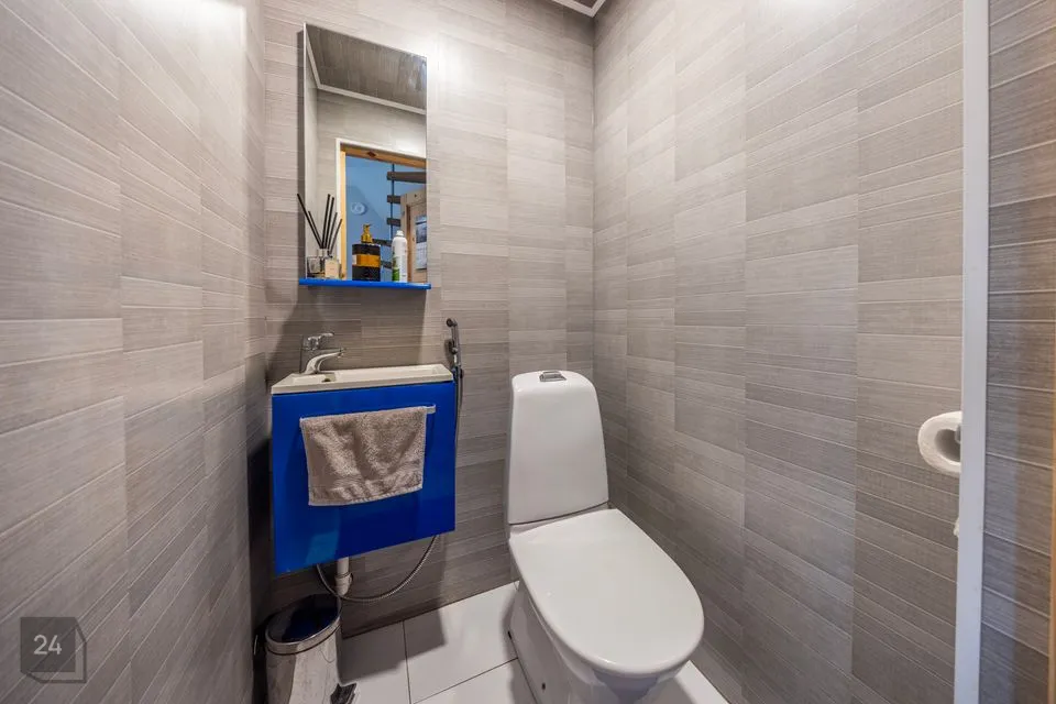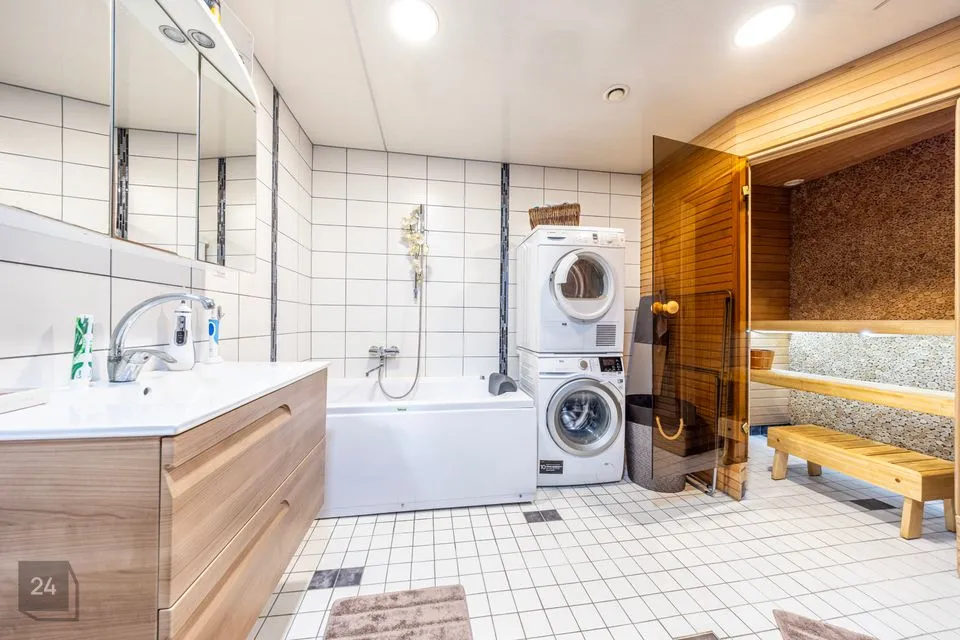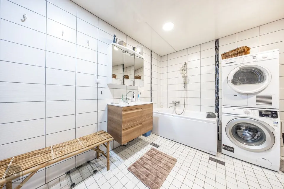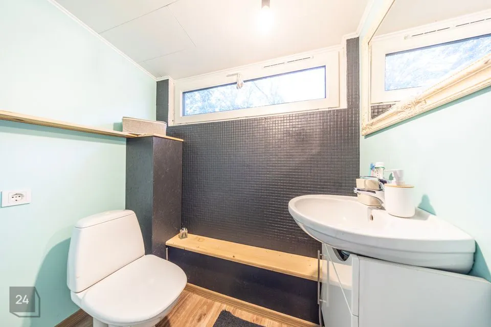 Elutoa kõrval koridori osas vannituba, kuhu on mahutatud hästi vann, kui ka dušh.