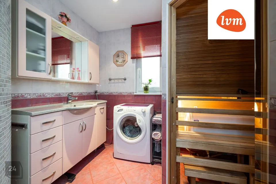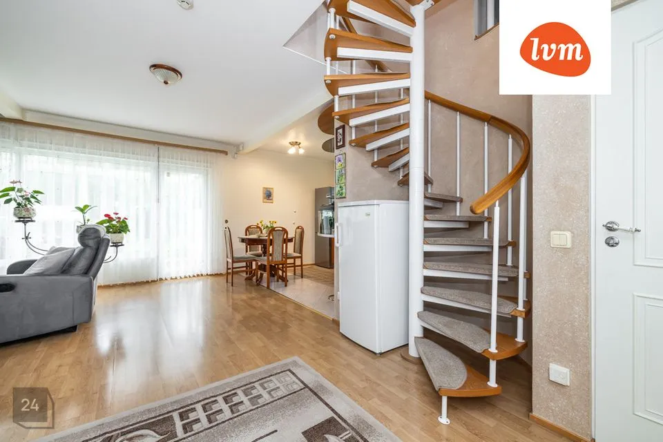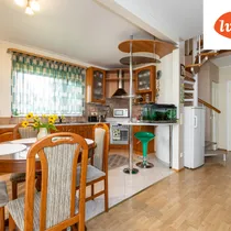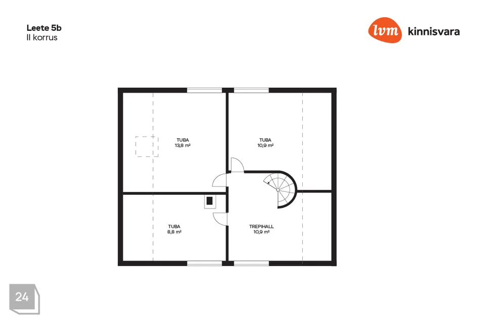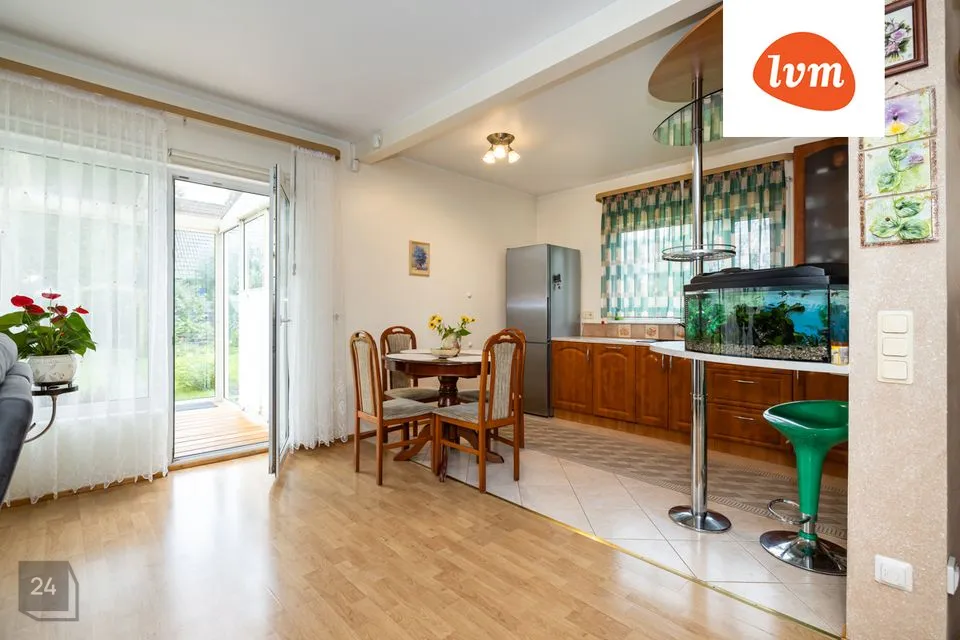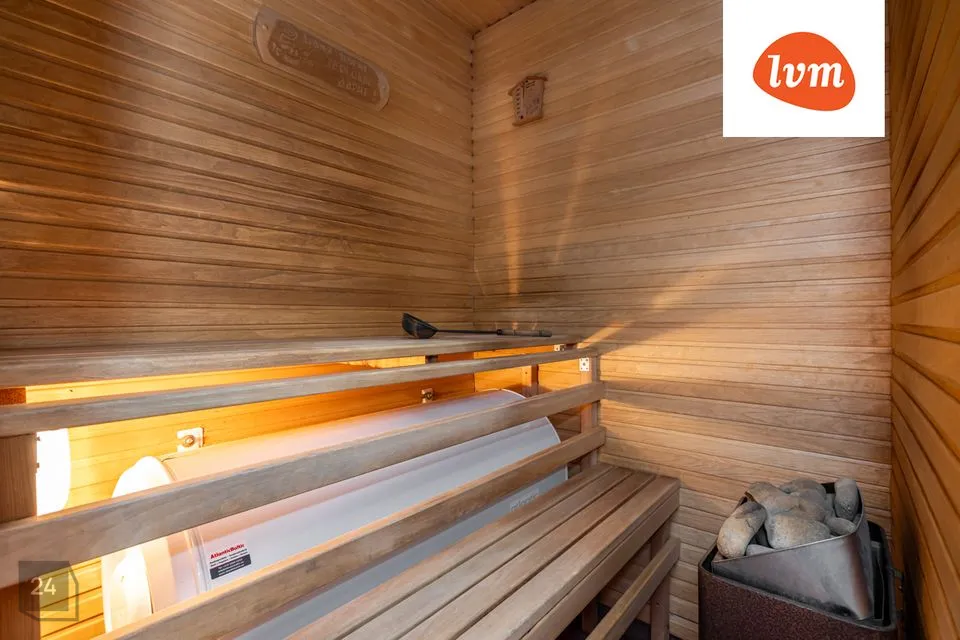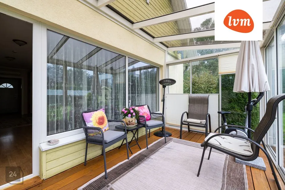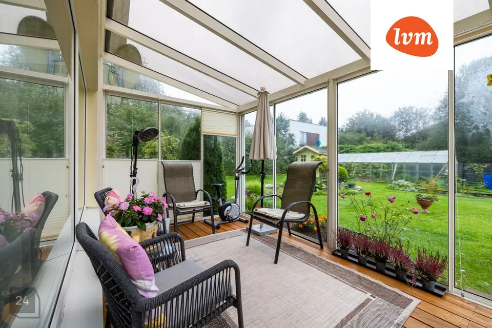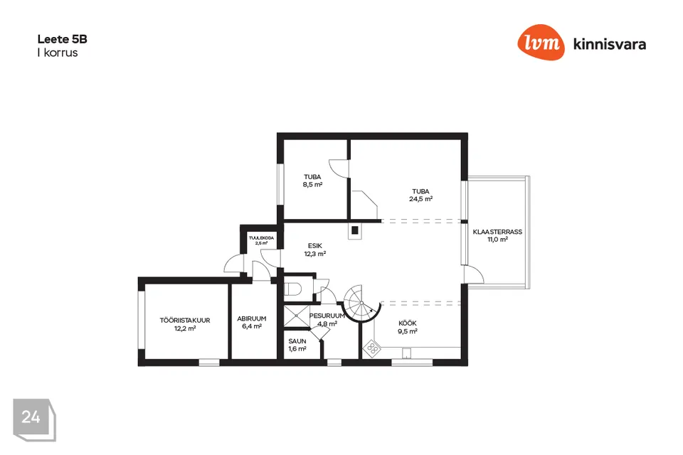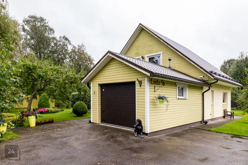 tuulekoda; esik, kus on sisseehitatud garderoobikapp; suur avatud elutuba-köök, kust pääs mõnusasse päeva/õhtupäiksepoolsesse talveaeda; kabinet/magamistuba; pesuruum koos leiliruumiga (elektrikeris) ja eraldi wc. Lisaks on garaaž, mis on hetkel jaotatud kaheks hoiuruumiks.
