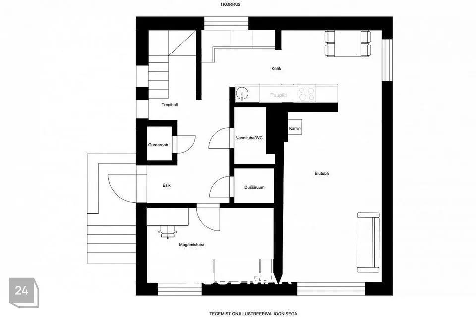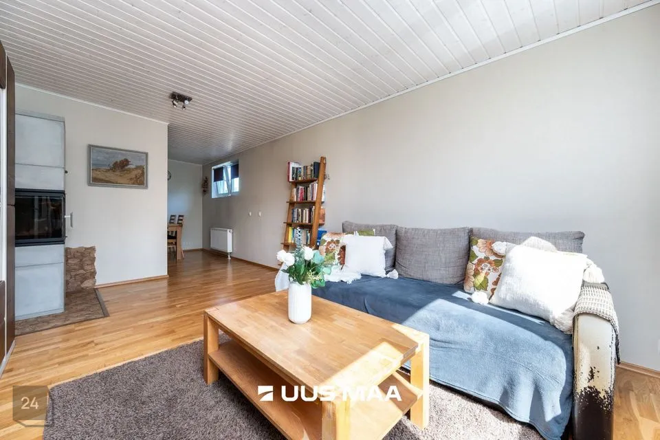 Selle 4-toalise maja esimesel korrusel on ruumikas elutuba koos kaminaga ning köök söögitoa osaga. Planeering on hästi mugav ja loogiline.