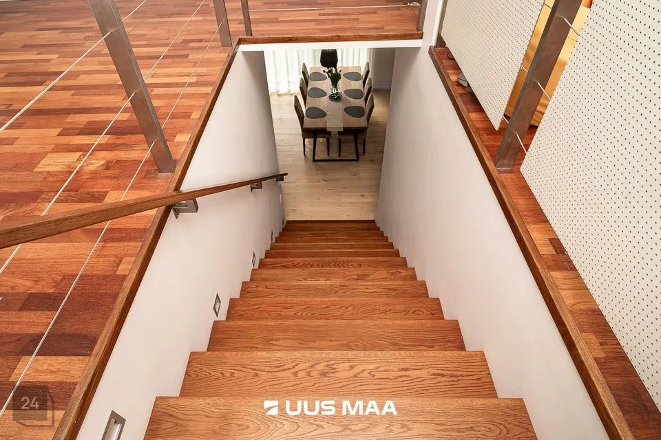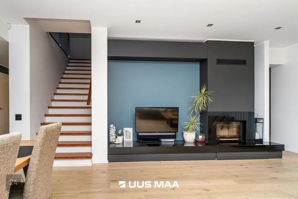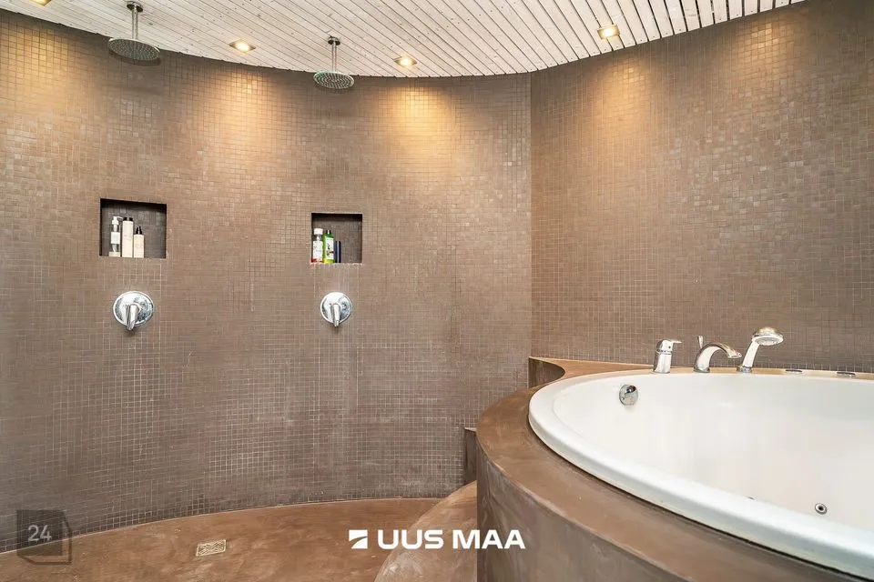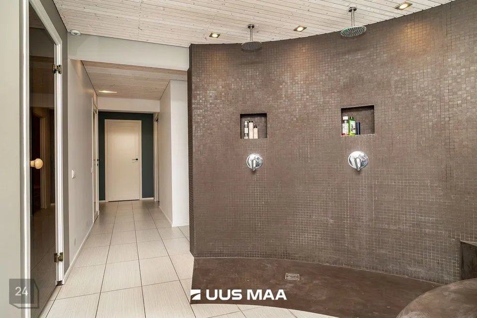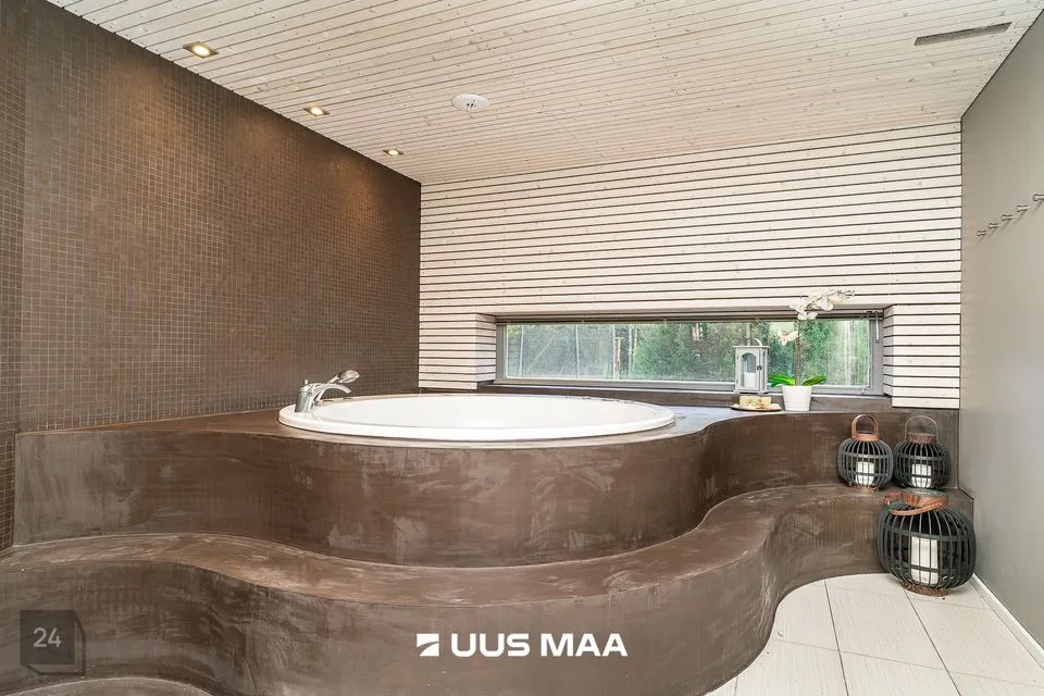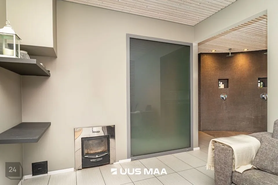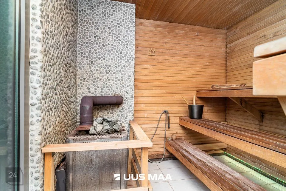 First floor: entrance hall + separate walk-in closet, spacious living room with fireplace, open kitchen, sauna with wood-burning stove and pre-room, bathroom (2 showers + jacuzzi tub), separate WC, pantry, utility/storage room, garage, boiler room.