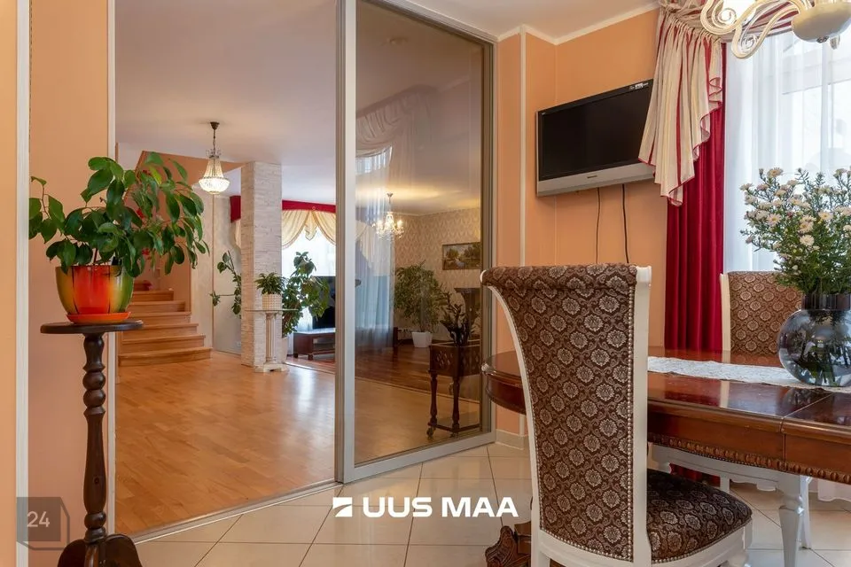 Maja peauksest sisenedes satume esikusse, kus on garderoob ja ligipääs garaaži. Hallist pääseb majapidamisruumi, köök-söögituppa ning kaminaga elutuppa. Mugav L-kujuline köök on iga kodukoka unistus. Kvaliteetne Itaaliast pärit köögimööbel on paigaldatud umbes 8 aastat tagasi. Köögis on rohkelt hoiustamisruumi ja töötasapinda ning lisaks eraldi sahver. Esimesel korrusel asub ka saun koos puiduküttel kerise ja mõnusa puhkeruumiga, kust pääseb otse sisehoovi.