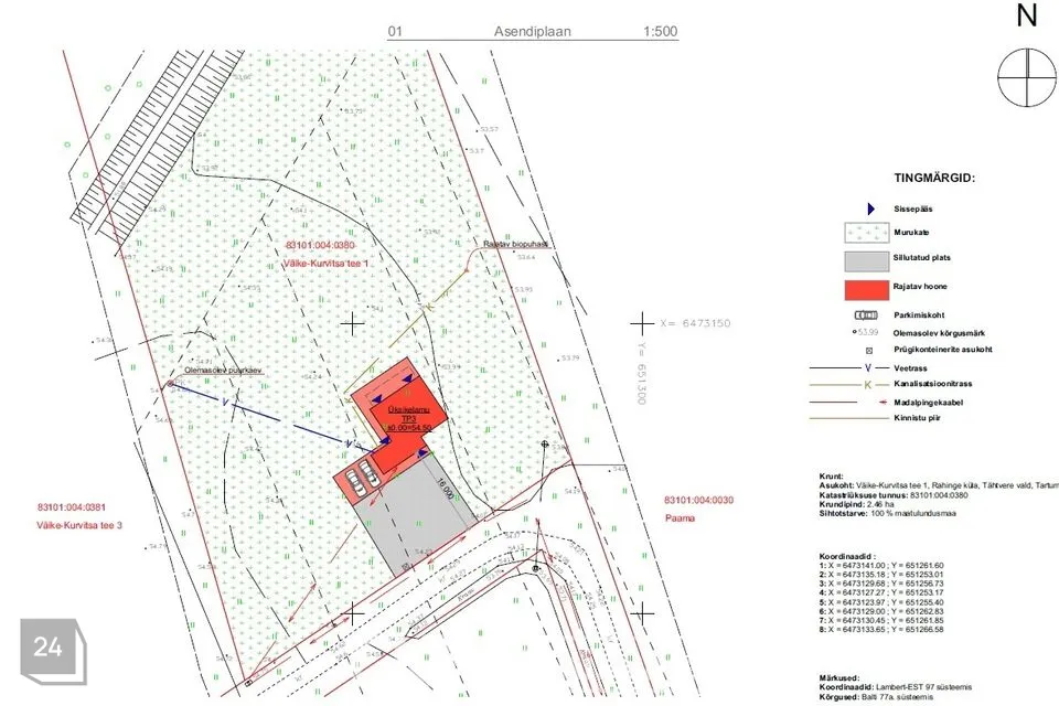 Kinnistu põhjapoolne osa ca 1,8 ha on enamuses metsamaa ja lõunapoolne osa kinnistust ca 5600 m2 hooviala. Kinnistul paiknev elamu on ehitusjärgus kinnine majakarp. Plekk-katus, 3 kordsed pakettaknad, esimese korruse põrand valatud koos vesipõrandakütte kontuuridega.