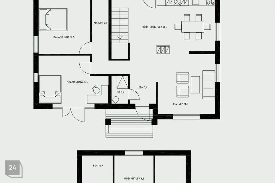 • 3 magamistuba – 23,2 m² (master-bedroom terrassile pääsuga), 15,4 m² ja 14,5 m²